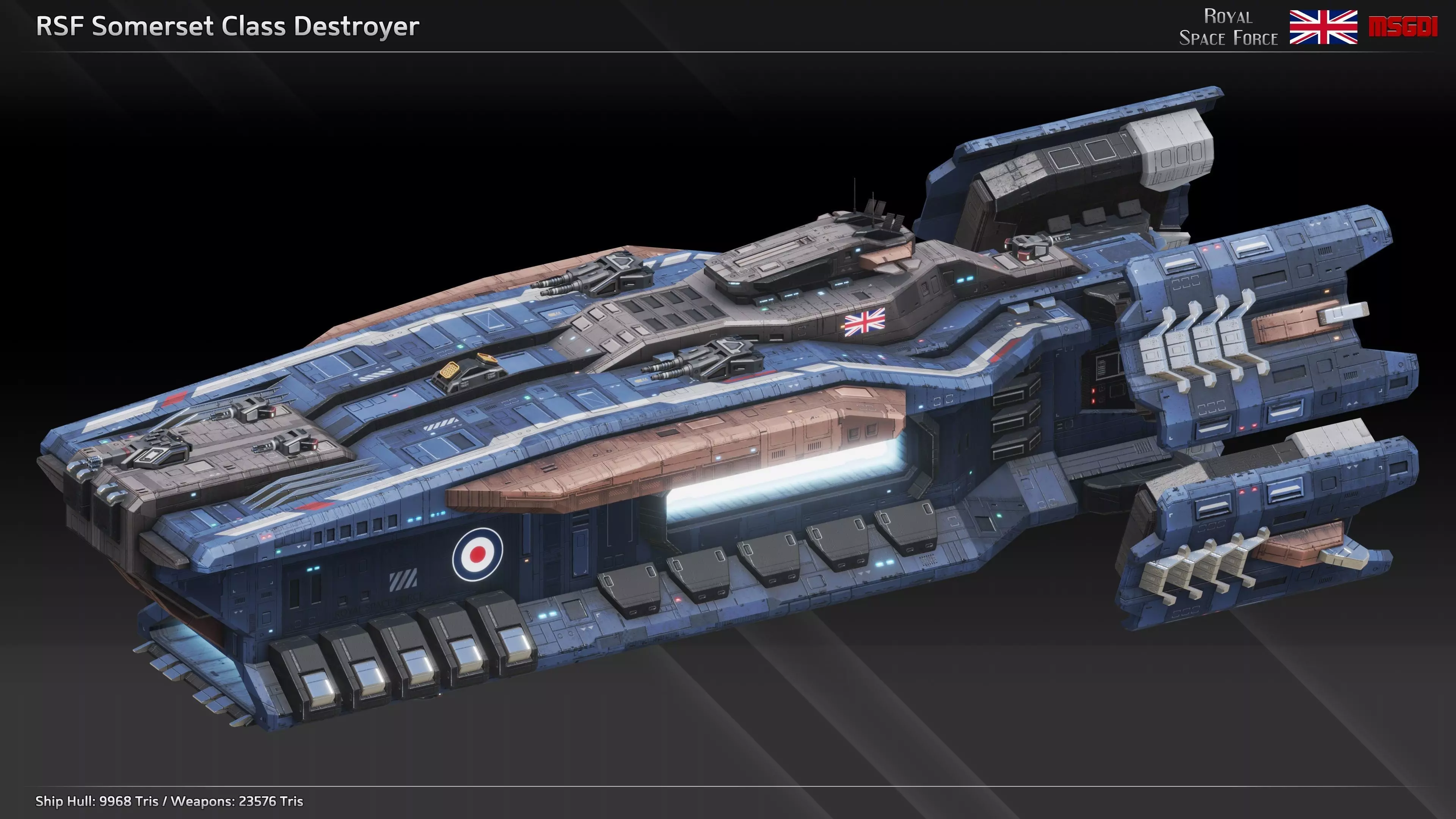 This pack contains the Somerset class destroyer of the Royal Space Force with modular weapons. It can be used in a space themed game.