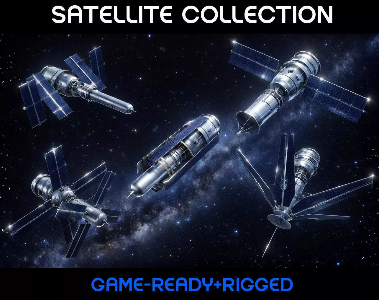 Designed for games, cinematics, and space environments, each satellite captures the elegance of human engineering drifting in the infinite dark.