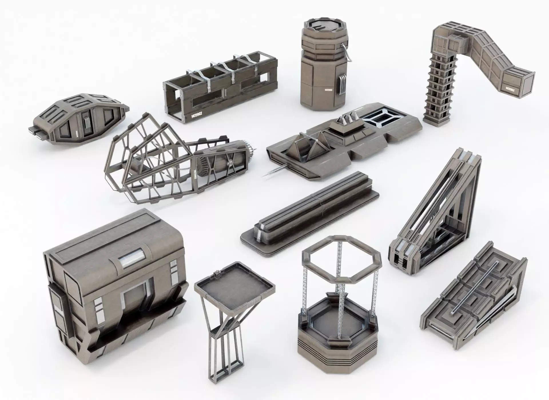 This Sci-fi kitbash set / building dressing asset collection comes in the following file formats: blend (native), obj, stl, fbx, dae and ply.