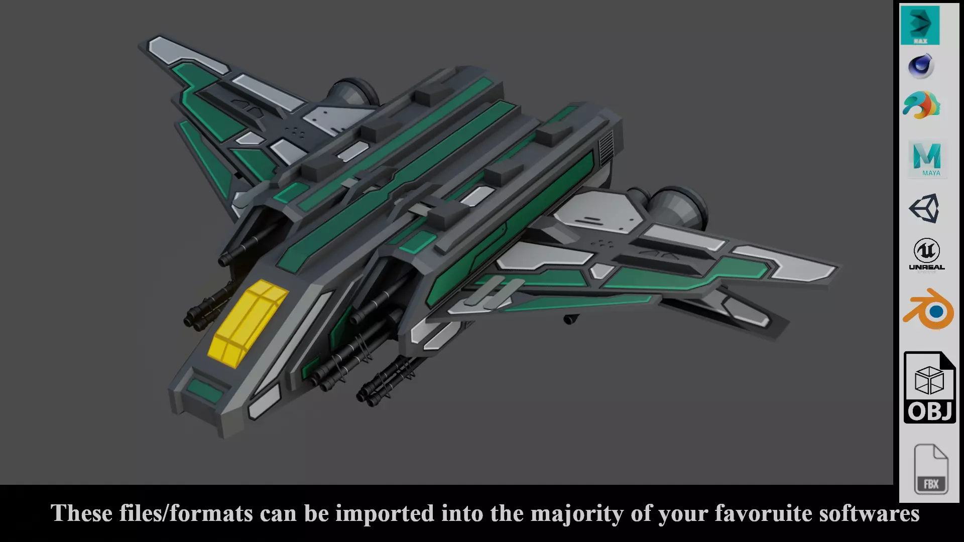 This sci-fi space ship 3d model is available in 5 Formats:Available Formats: