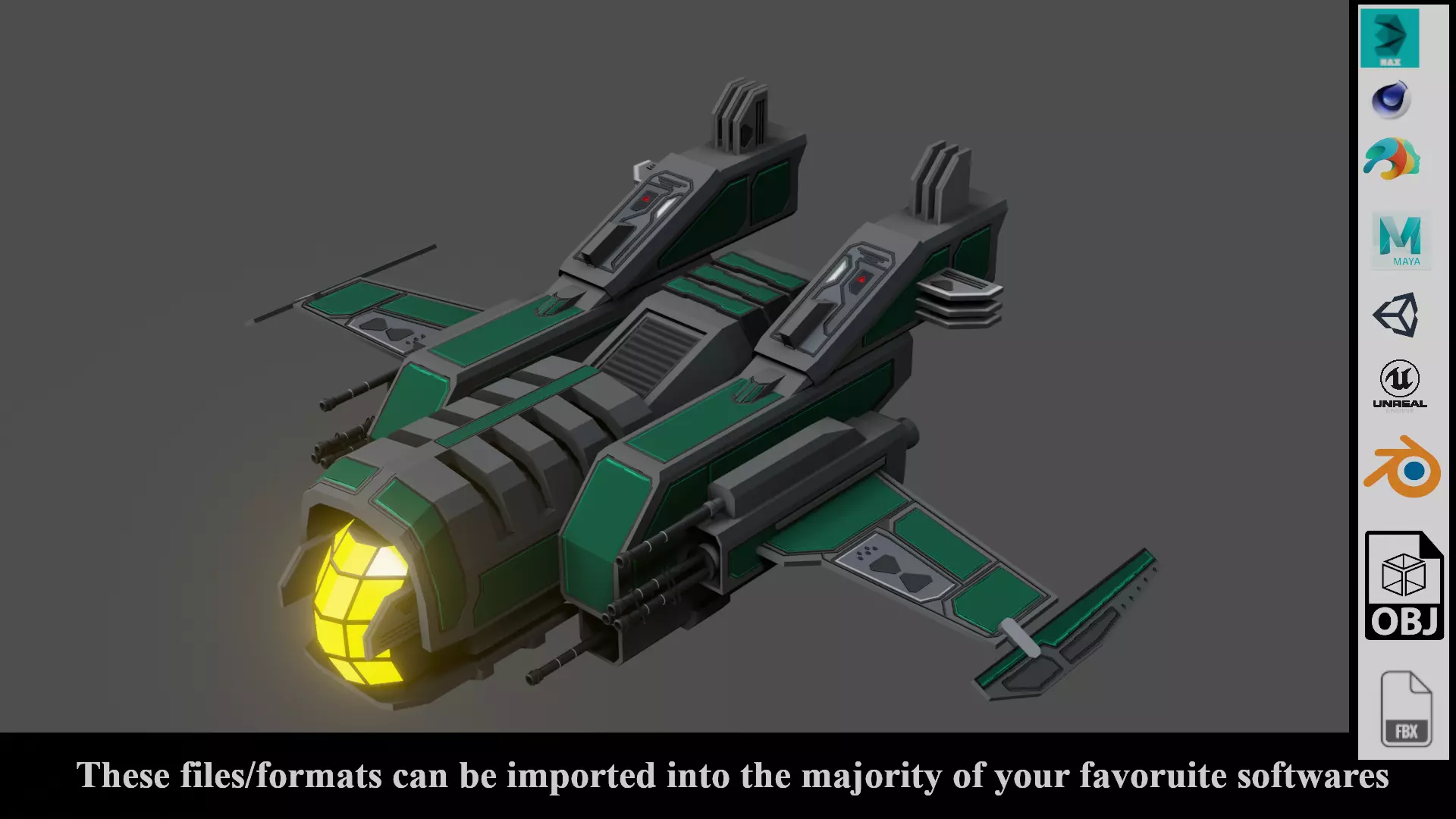 This sci-fi Fighter Ship 3d model is available in 5 Formats:Available Formats: