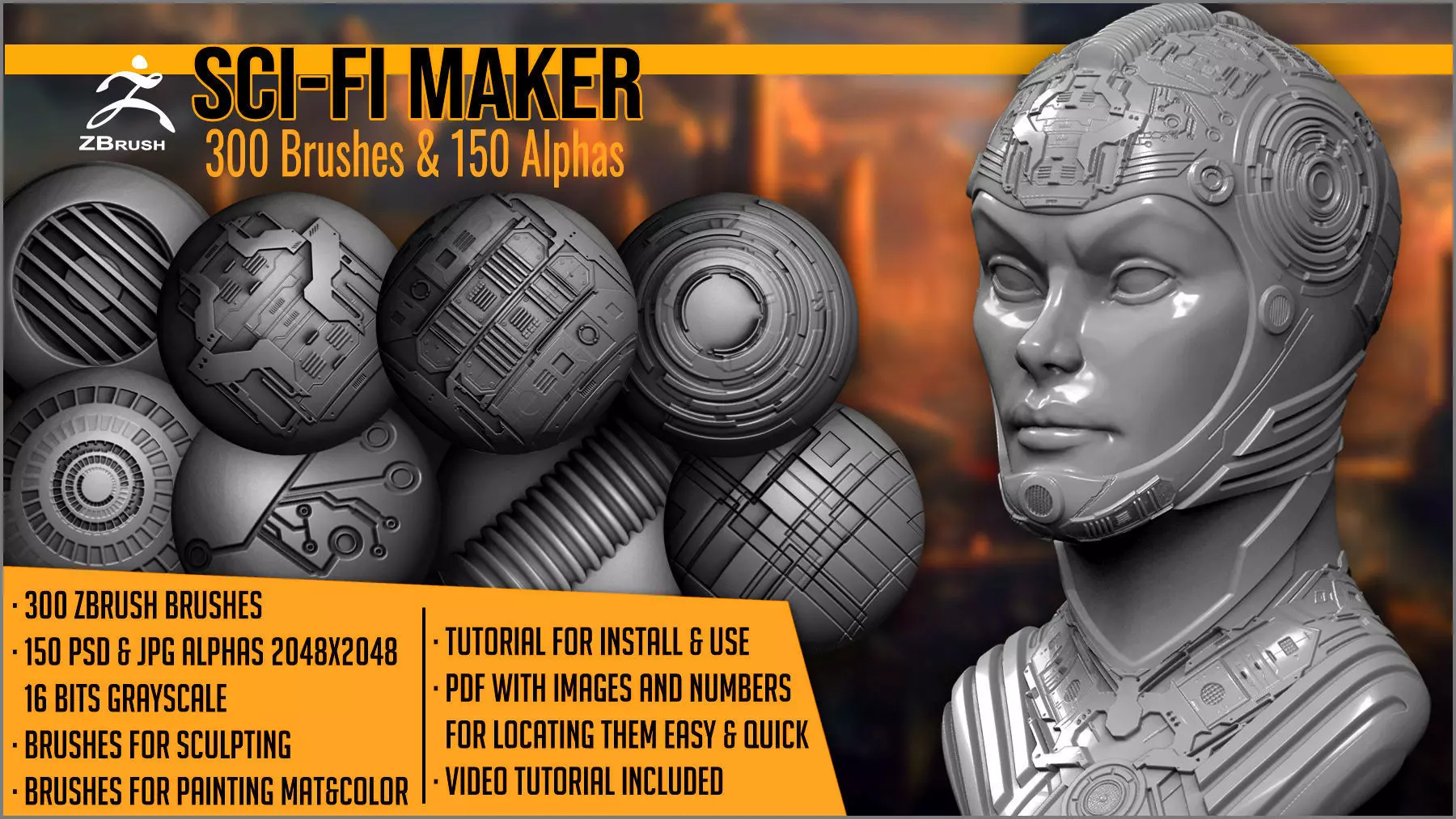Sci-Fi maker is a set of 300 brushes and 150 alphas for sculpting and painting sci-fi droids, cyborgs, space ships, sci-fi interiors, tech instruments and gadgets, computers, robots, machines, and other futuristic and tech props.