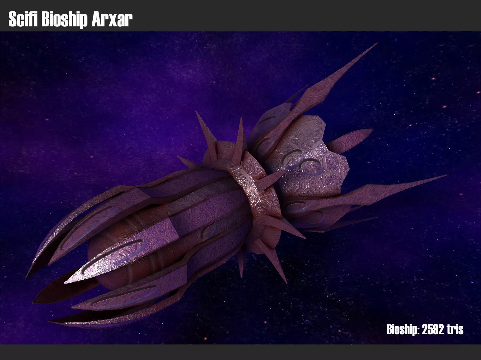 This pack contains an Arxar scifi bioship. It can be used in space RTS games or in a topdown or sidescroller game. It can also be used in a 3rd person spaceship shooter.