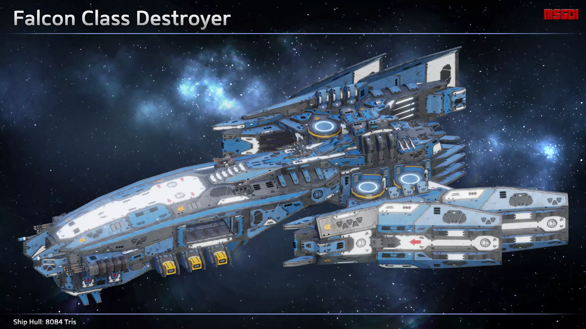 This pack contains a Falcon scifi destroyer with weapons and equipment. It can be used in space games.