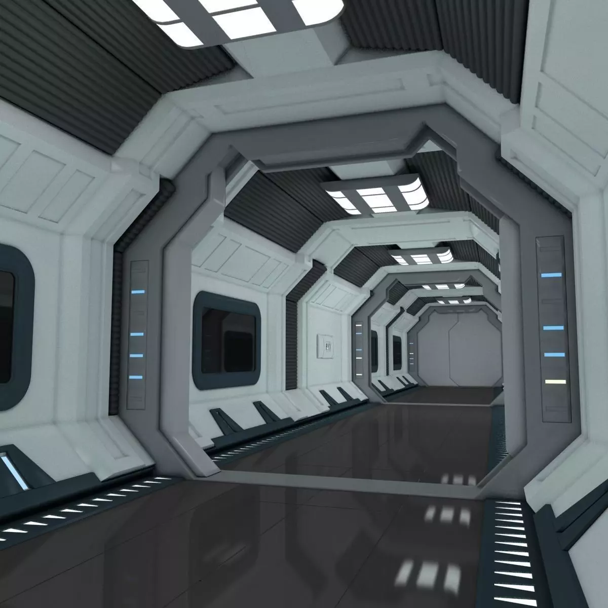 DESCRIPTION-This is a highly detailed and photo realistic 3D scene of a Spaceship Corridor, complete with interlocking blast doors. The design is modular, and each section can be duplicated or reduced to create a corridor of any length.