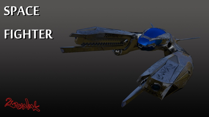Space fighter silver and blue. Alien markingns. Twin jet engines.