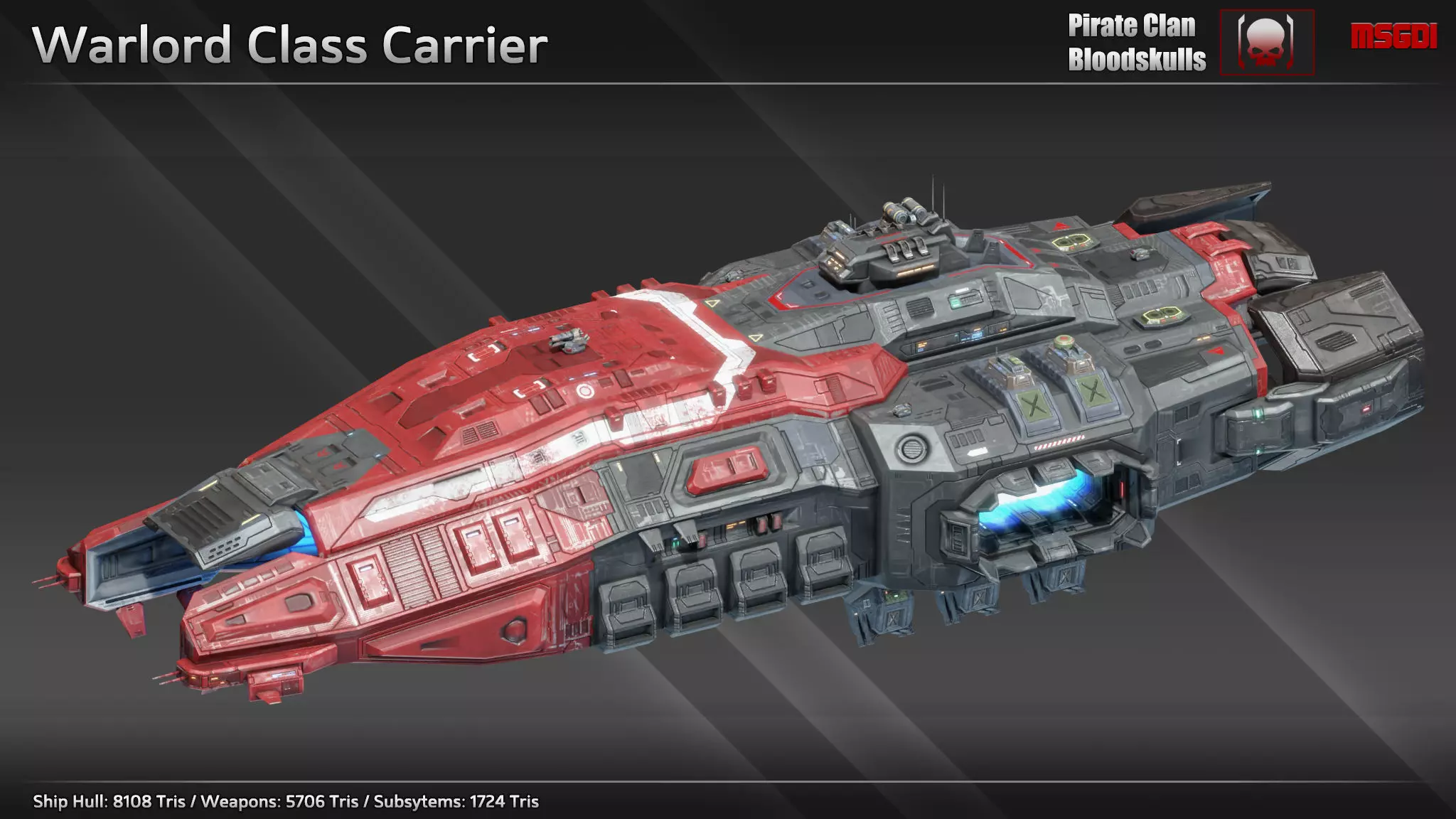 This pack contains a Warlord carrier with modular weapons. The spaceship can be used in a space themed game.
