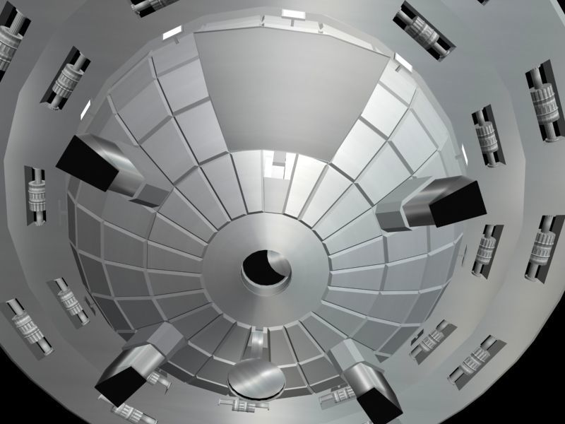 The scene is partly animated - 2 rings turn in opposite directions (frames 0-200), main hatch opens and landing gear extends (frames 7-80), lift shaft doors and lift door opens/closes (frames 20-30-40), scanner in medical cabin works (frames 100-200).
