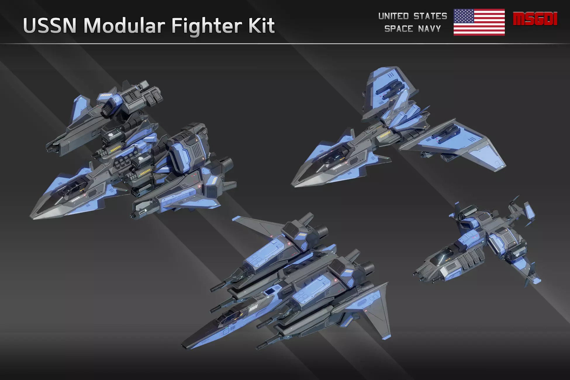 This pack contains a modular scifi fighter kit of the US Space Navy with modular weapons. The spaceships can be used in a space themed game.