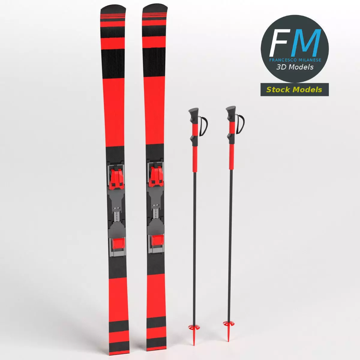 Alpine skis with poles 3D Model. 4 objects, 3 Materials (poles share a single Material with a non overlapping UV Layout map), with non overlapping UV Layout map, Material and PBR Textures set. Production-ready 3D Model, with PBR materials, textures, non overlapping UV Layout map provided in the package.