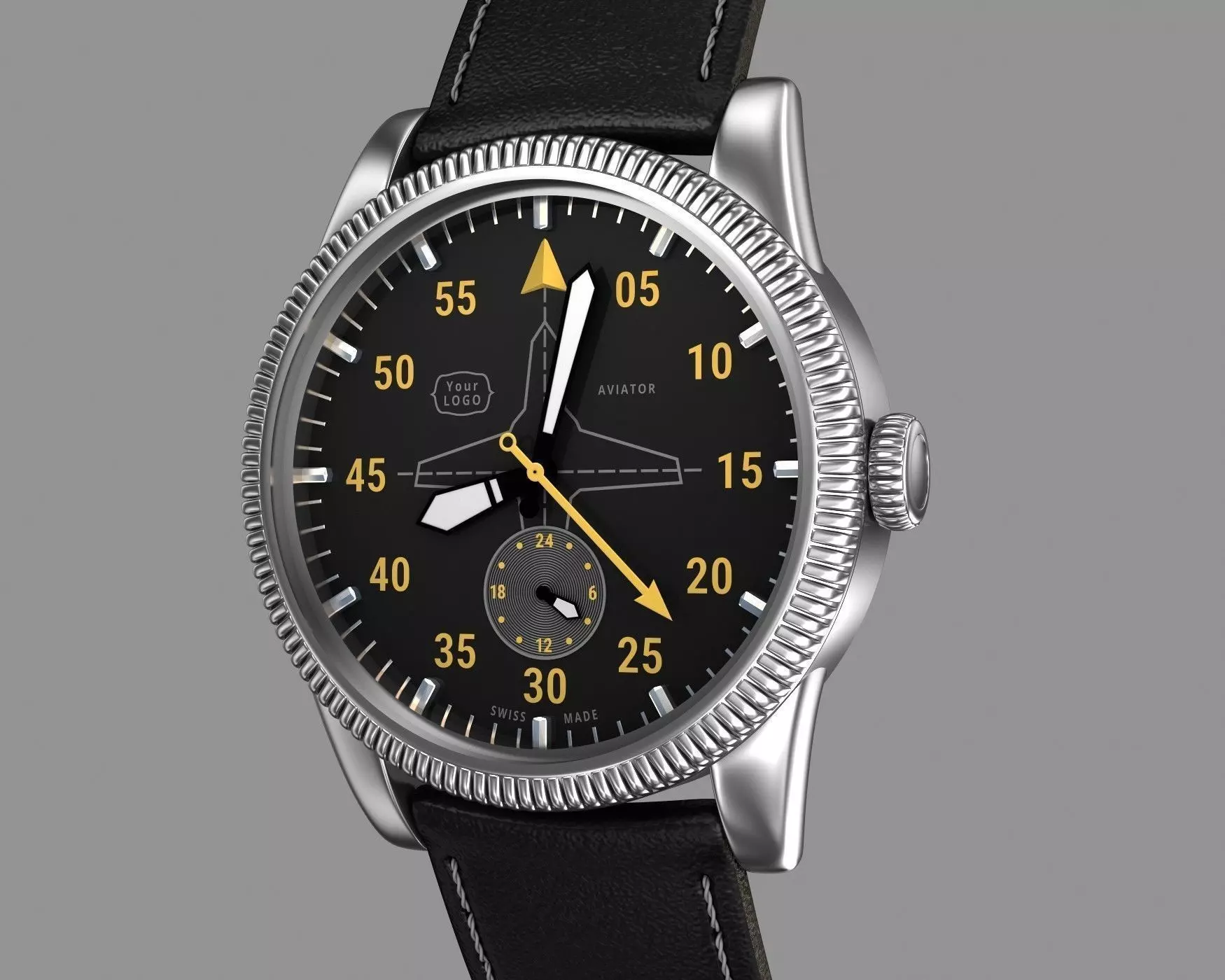 Aviator wrist watch. My own design. No existing brands used. Can be produced.Hi-Poly 3d model of modern pilot watch with leather strap and classic clasp.In this watch was used Miyota 6P28 quartz movement , but you can put another movement as you want. Where is enough free space inside to put bigger size movement.Free space inside case - Diametr : 34 mm x Height : 5,5 mm