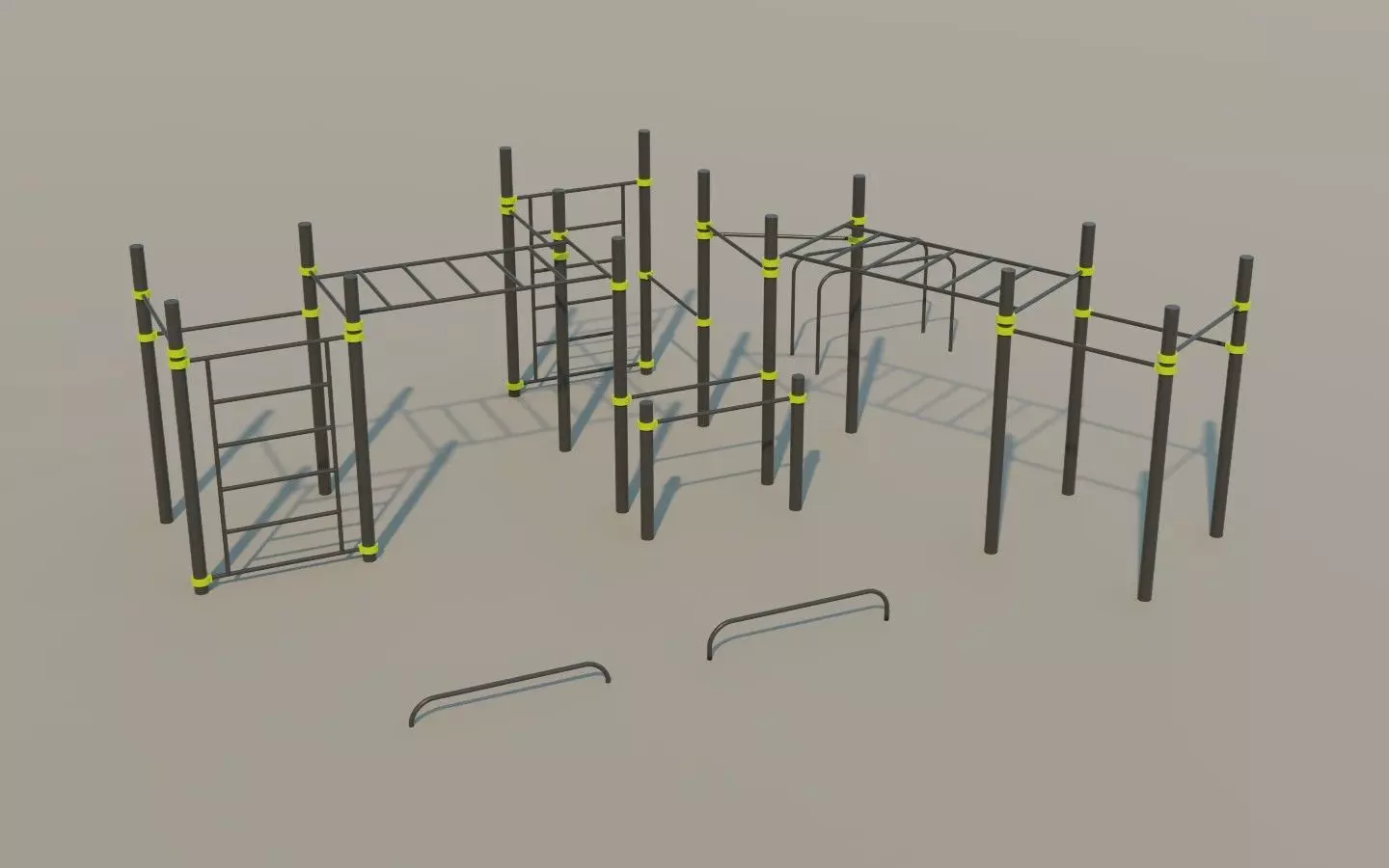 Modern Calisthenics outdoor exercise equipment for parks.Pullup bars of various heights, Parallel Bars, Monkey Bars. This Calisthenic station is ideal for Dips, Pullups, Chinups, Pushups, Muscle Ups and all the basic bodyweight exercises.The 3D model is meant for 3D rendering, archiviz, 3D scenes and not for 3D print.Good level of detail.If you want to reduce the polygon count, open Blend file and disable the bevel modifier on each object.Vertical Poles height: 265cmFull Calisthenics Station dimensions: about 875x650cm