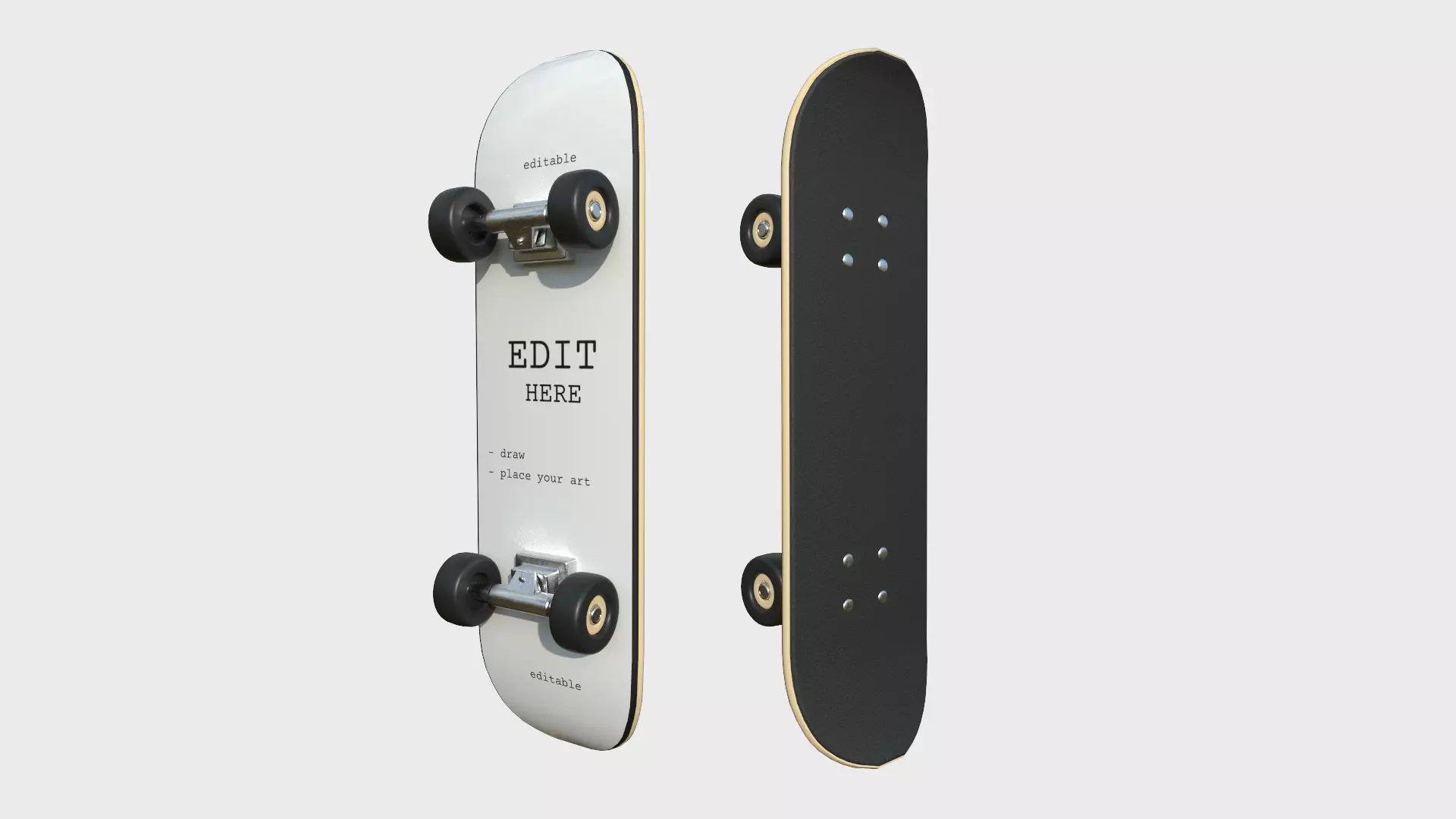 IMPORTANT: This model has an editable color map, so you can place your own art in the skate board. The editing instructions are in a .txt file with the maps.This will require a basic skill in image edition to create your own color map.