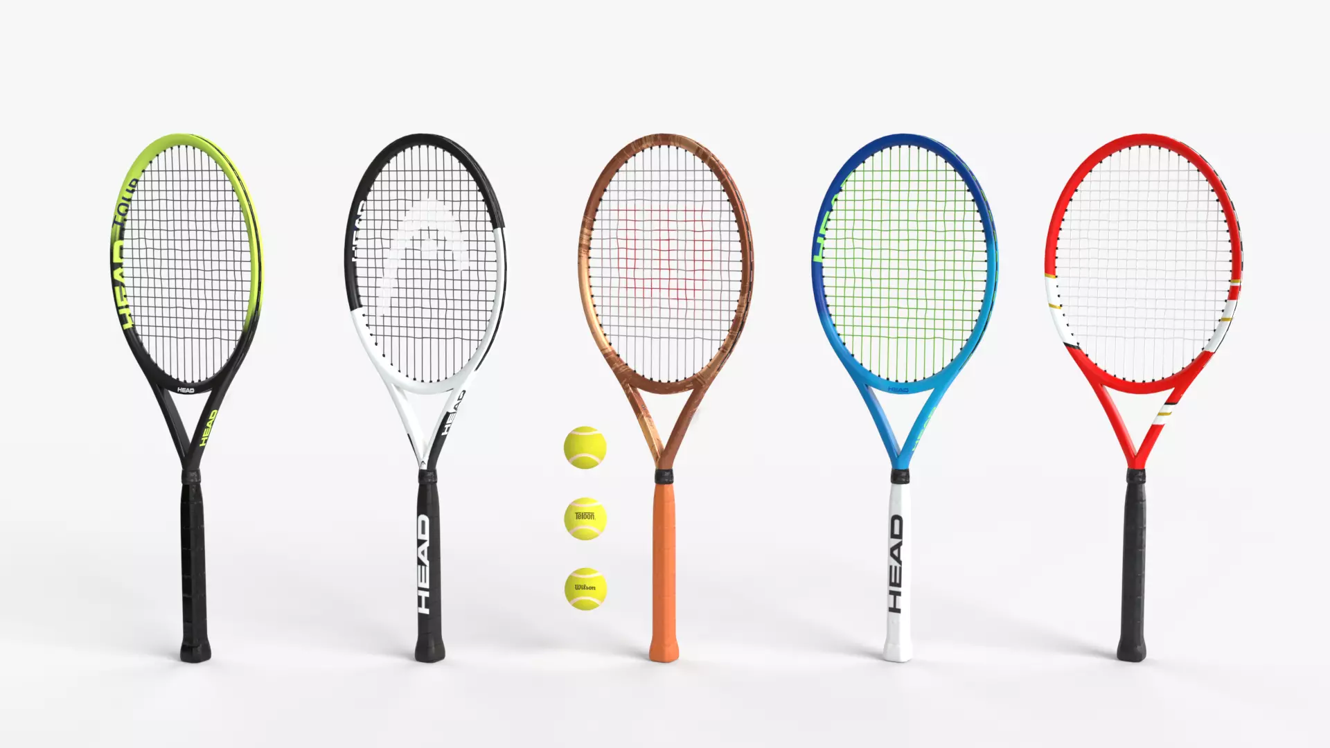 Collection of tennis Rackets and balls5 different tennis Rackets and 3 ballscolors: black & green colors: browncolors: black & white colors: white & blue colors: black & red