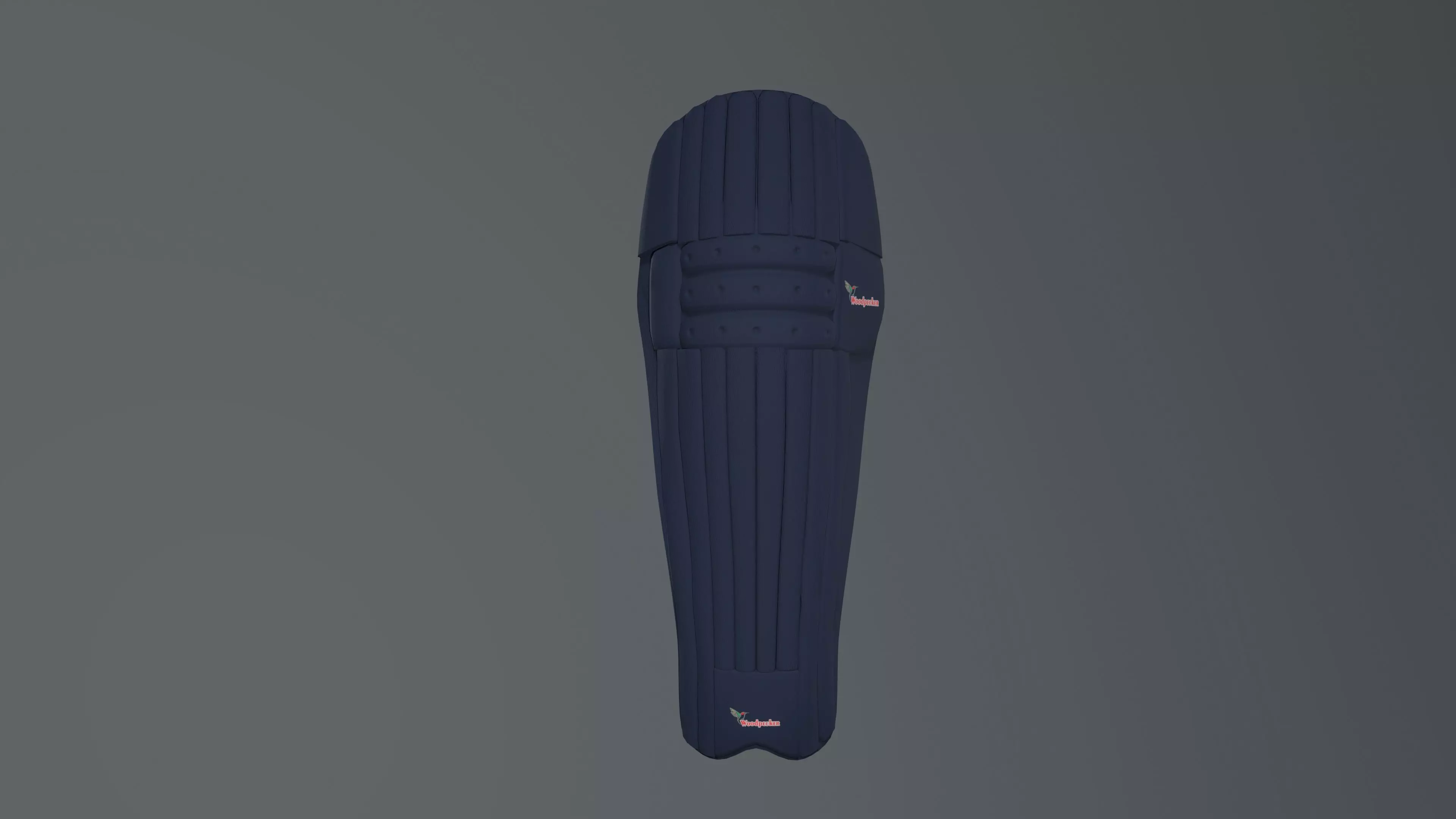 This is a realistic 3D model of a cricket leg guard, created in Autodesk Maya and textured in Substance Painter. The model consists of two parts: the pad and the strap. The pad covers the front of the lower leg and has a curved shape to fit the leg comfortably. The pad has a navy blue colour with a woodpecker brand logo on the top. The logo is white and has a stylized woodpecker shape with the word Woodpecker below it. The pad has a smooth and shiny surface with some subtle scratches and dirt marks to add realism. The strap wraps around the back of the leg and secures the pad in place. The strap has a dark grey colour with a velcro fastener. The strap has a rough and matte surface with some wrinkles and folds to show its flexibility. The model has a high level of detail and accuracy, and can be used for various purposes such as animation, rendering, or game development.