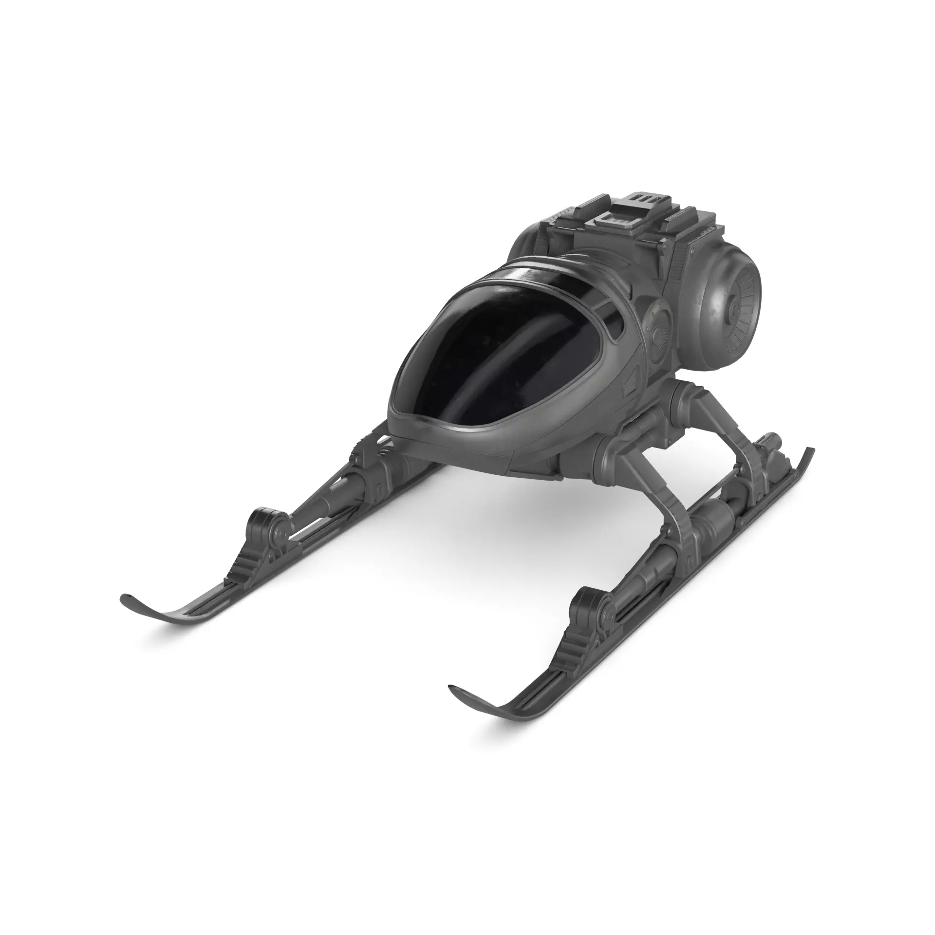 A futuristic expedition sled designed for civilian use in snowy and icy terrain, featuring a sleek and aerodynamic shape with a metallic silver finish, equipped with advanced utility and specialized equipment for efficient transportation on snow-covered landscapes in the future.