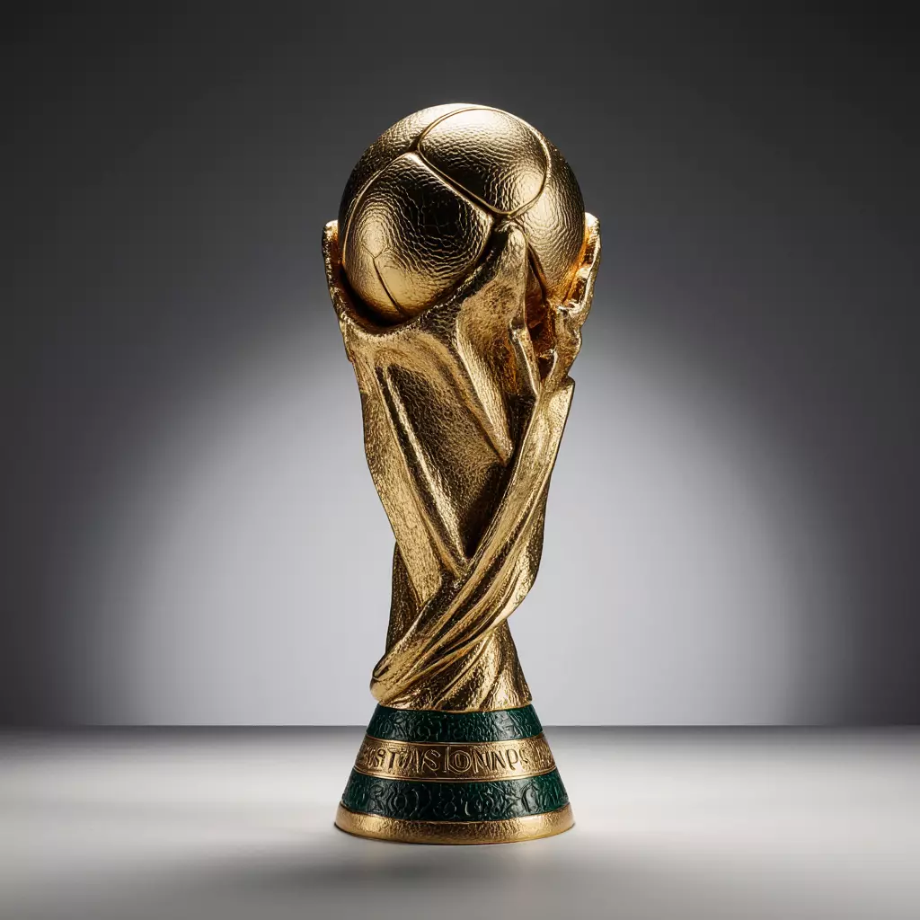 This 3D model is a highly detailed and accurate representation of the official FIFA World Cup Trophy. The trophy is a solid gold model depicting two stylized human figures holding up the Earth, which is represented by a golden soccer ball. The base is a distinctive malachite band with the words FIFA WORLD CUP and other text inscribed on it. The gleaming gold surface and the iconic swirling forms of the figures are meticulously recreated, capturing the prestige and historical significance of the most coveted trophy in football. This model is perfect for sports-themed visualizations, game environments, virtual reality experiences, or any project that requires a high-quality symbol of global sporting triumph.