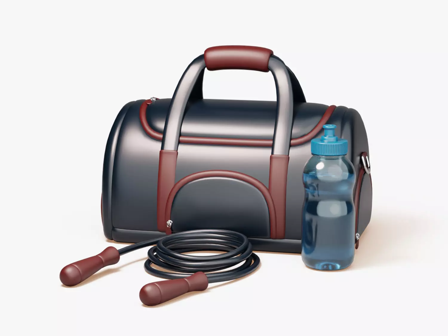 Stylized fitness accessory set that includes a dark duffel gym bag with contrasting burgundy handles, a coiled jump rope with matching grips, and a clear water bottle with a blue cap. Rounded corners, clean seams, and soft highlights give the bag a premium sporty look, while the color accents keep the items visually linked. The arrangement is compact and readable, so each object can be isolated or used together as one scene.