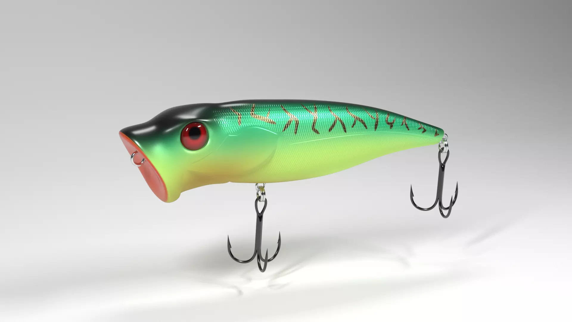 This is a colorful popper. Hard lure has precise shapes and rich natural colors. Equipped with sharp hooks.The model includes 4 textures sets:PBR metallic roughness;PBR specular glossiness;PBR for rendering in Arnold renderer;PBR for rendering in V-ray renderer;Texture Size: 4096x4096 .Textures created in Substance Painter.Vertices:4180Polygons:4214Model created in 3dsmax 2018 + V-ray render.3dmax files are ready for rendering.