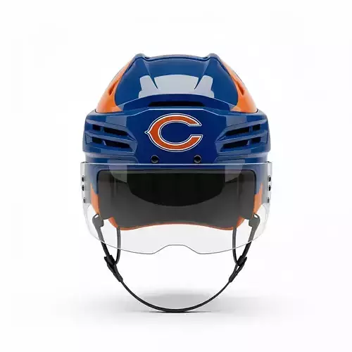 This is a detailed 3D model render of a modern ice hockey helmet complete with a clear protective visor. The helmet is primarily a high-gloss dark blue and features a prominent orange stripe down the center, using a color scheme often associated with the Chicago Bears (NFL) or other blue and orange sports teams. A circular logo, incorporating the iconic orange 'C' letter with white outline, is centrally placed on the front. The design showcases realistic vents, internal padding details (visible through the visor mounting), and a functional chin strap (partially visible). This high-quality 3D asset is ideal for sports visualizations, virtual reality applications, game development, or promotional materials related to hockey and branded sports merchandise.