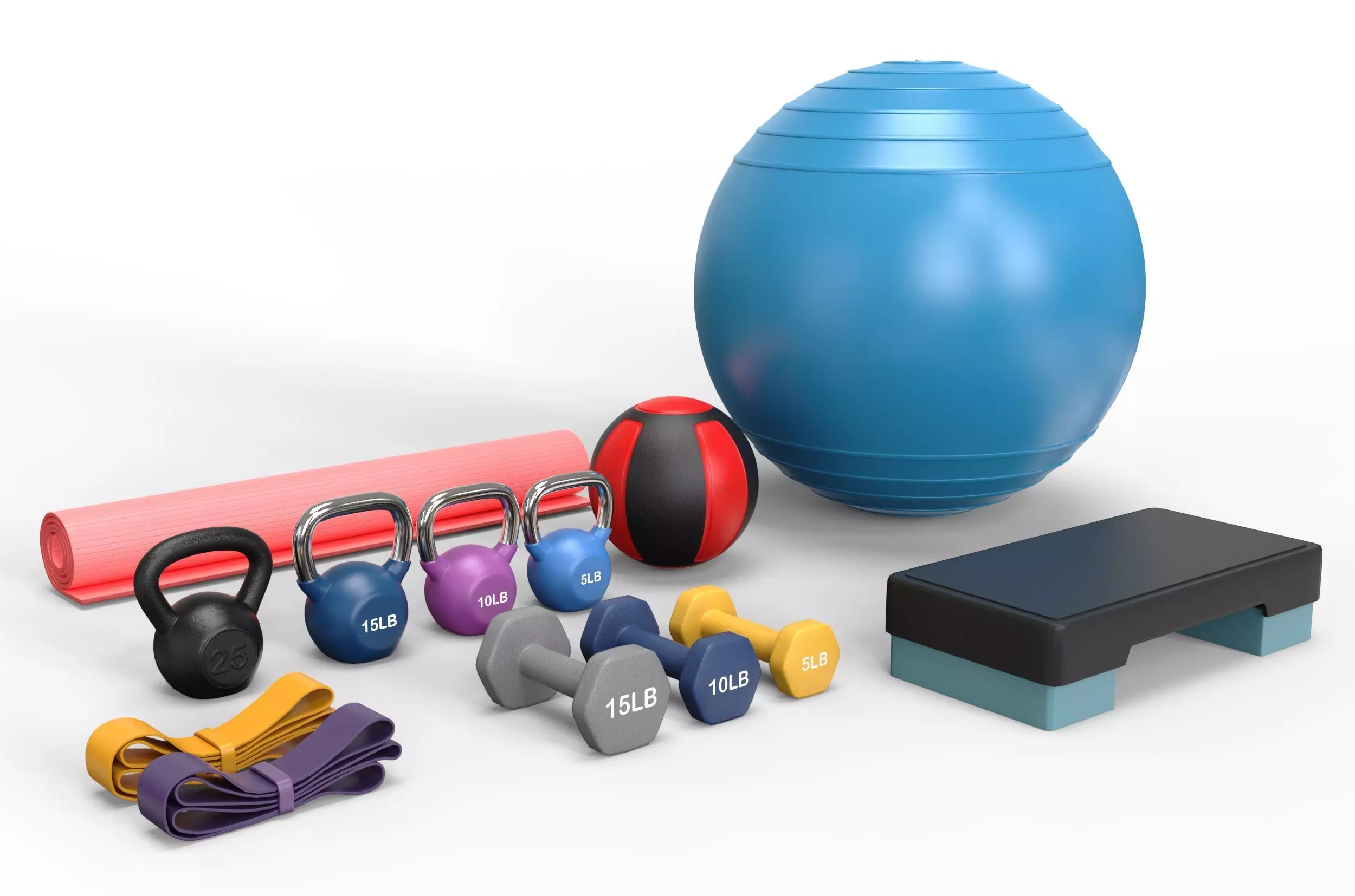 Home gym equipment ontains medicine ball, rolled mat, resistance band folded, 3 set of dumbbells with the number texture, kettlebells with their txture, one cast iron kettlebell, and a step platform. Everything is UV, and props are smooth.