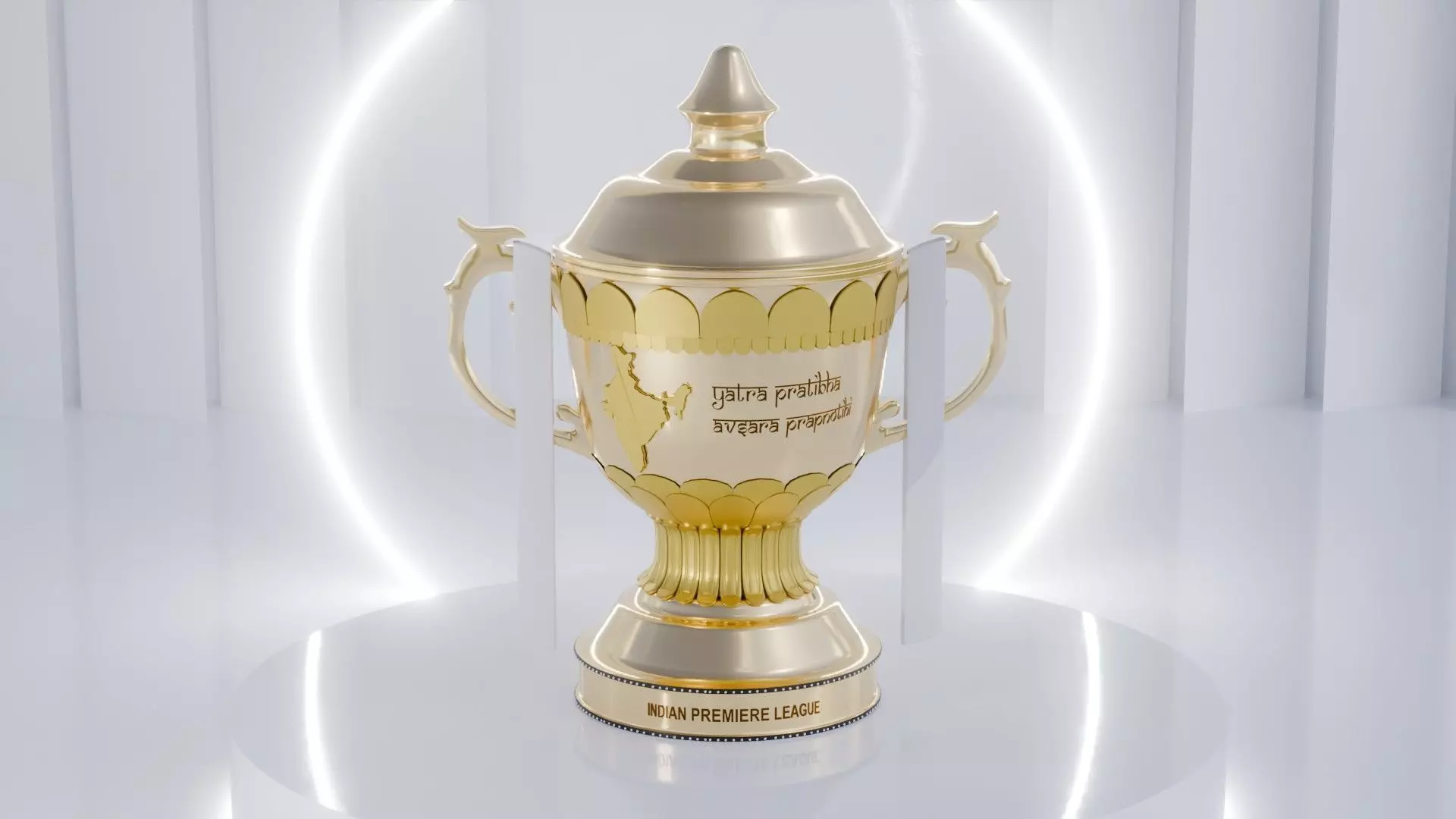 This 3D model showcases the iconic IPL trophy in exquisite detail, making it an exceptional choice for cricket fans and designers alike. The golden trophy features two elegantly curved handles and a reflective finish, symbolizing excellence and prestige. At its center, the engraving of the Indian map paired with the Hindi phrase 'यत्र प्रतिभा अवसर प्राप्तो' (Yatra Pratibha Avasara Prapnotihi) adds cultural significance and authenticity. The sturdy base highlights the engraved text 'INDIAN PREMIER LEAGUE,' grounding the design in its rich cricketing heritage. This meticulously crafted model is perfect for gaming, animation, sports-themed projects, or as a collectible digital centerpiece, celebrating the glory of the IPL.