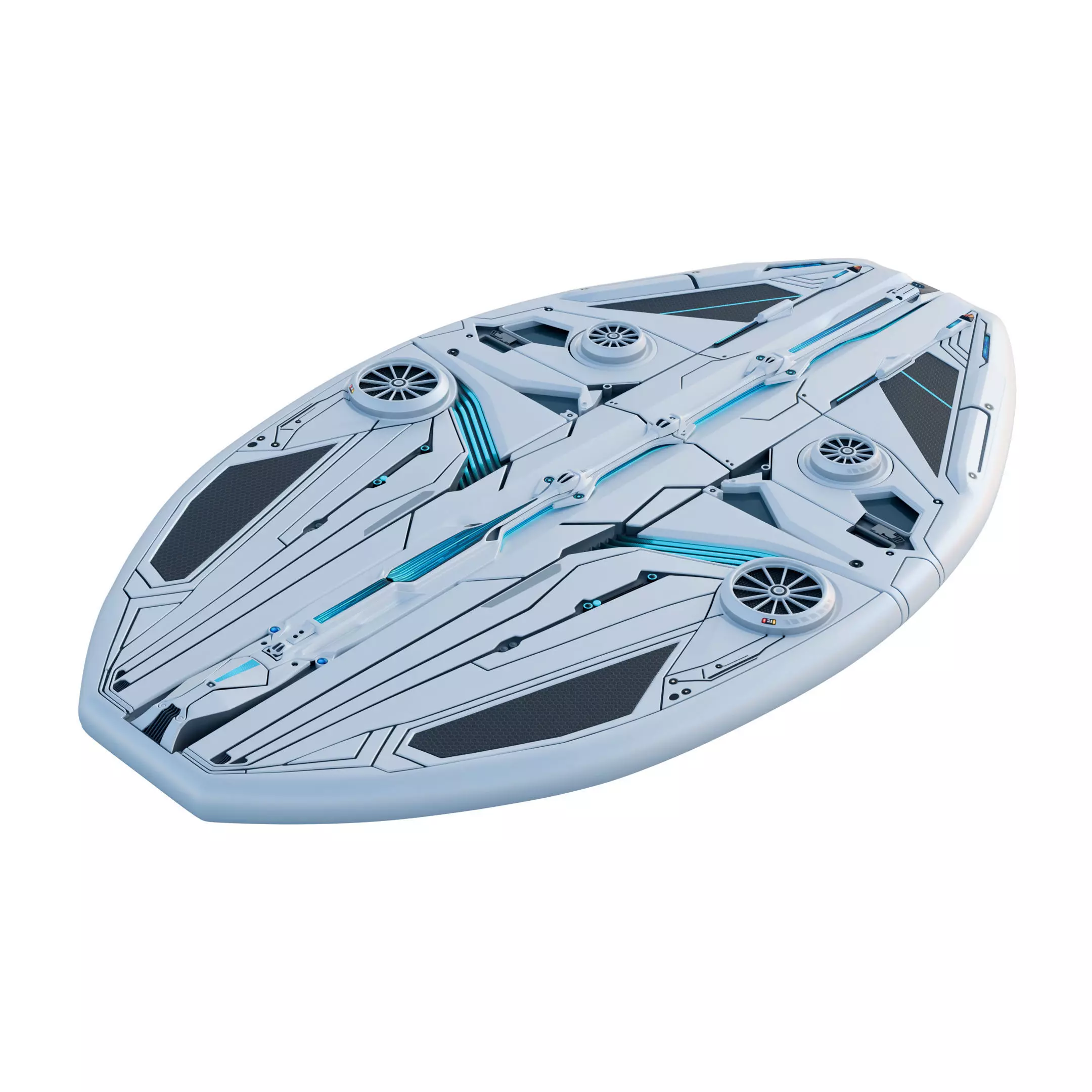A futuristic freestyle kite surfing board in shimmering silver with sleek, angular edges and neon blue accents, designed for ultimate performance in the advanced technology-driven world of the future.