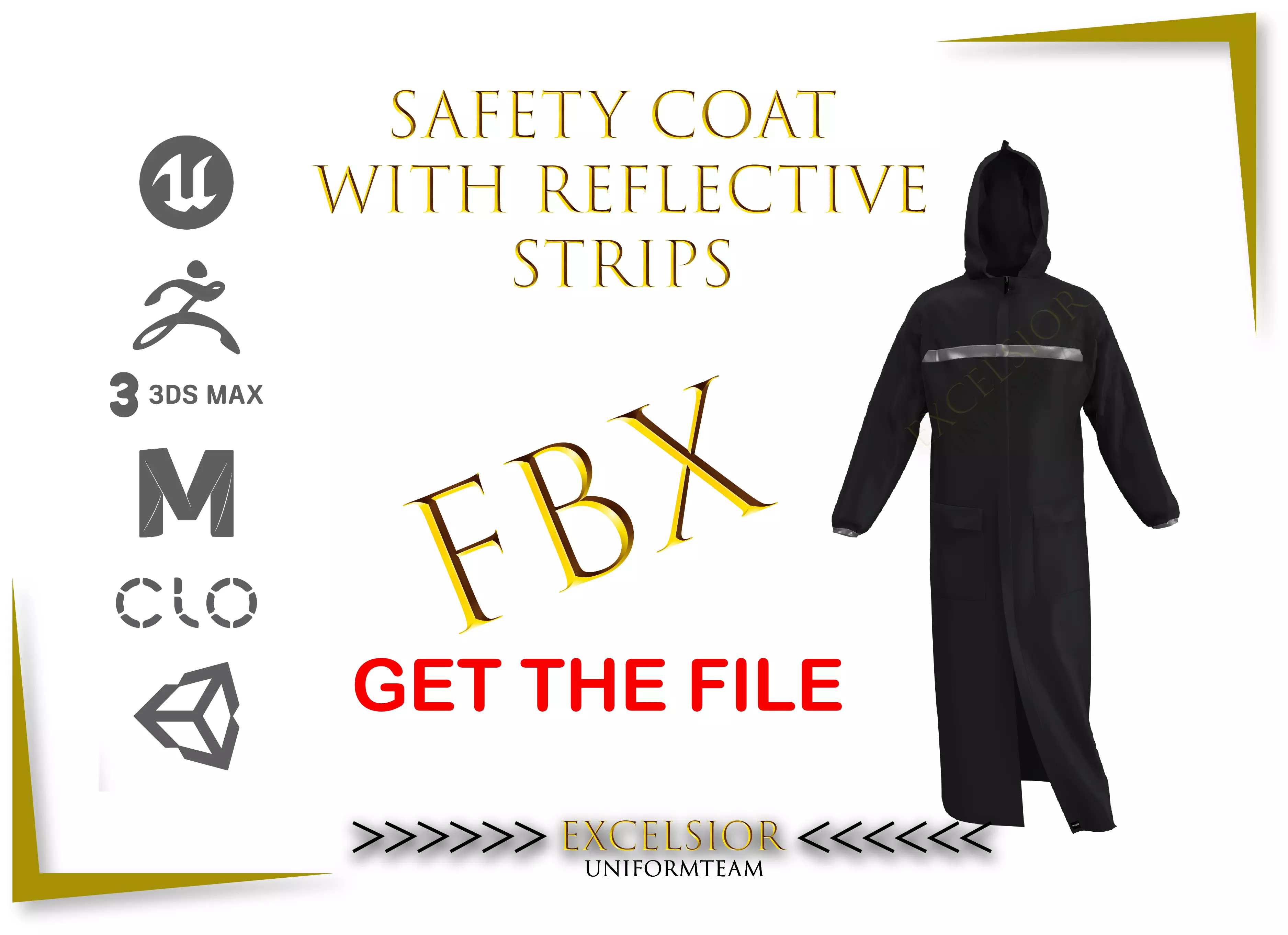 High-quality 3D model of a lightweight waterproof safety coat with reflective strips, designed for professional workwear and outdoor activities. Includes multiple vibrant safety colors and realistic fabric details. Perfect for game design, VR/AR environments, and apparel visualization.