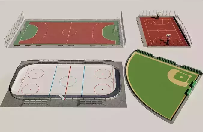This is a high-quality multi-sport courts 3D model pack, including basketball, soccer, ice hockey, and baseball fields. It is ideal for sports games, architectural planning, campus design, and sports facility visualization.