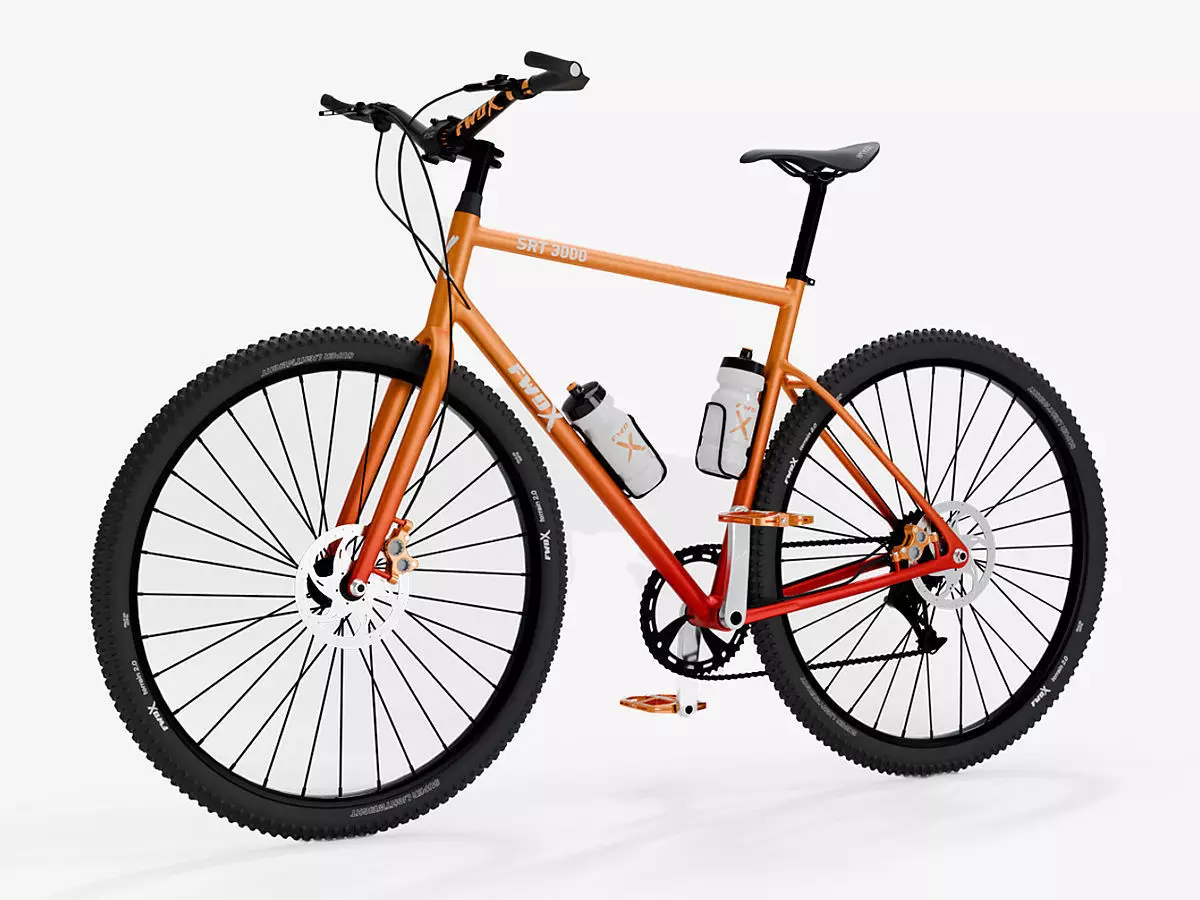 This 3D model features a detailed Mountain Bike with a custom, royalty-free fake brand—ideal for commercial use in product visualization, advertising, games, or motion graphics. The bike frame showcases a bold red-to-orange gradient paint job, giving it a modern and eye-catching look.
