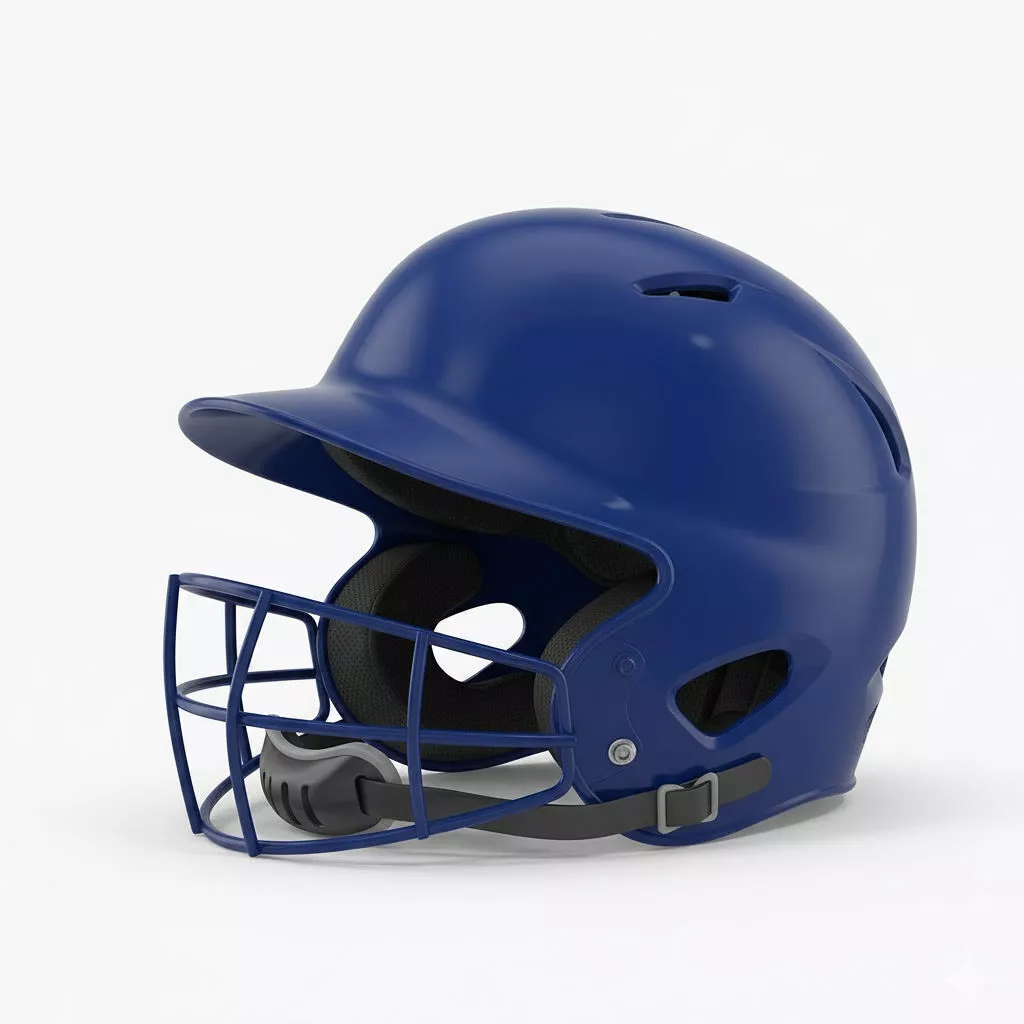 This is a high-quality 3D render of a professional cricket batting helmet, finished in a matte navy blue. The model features a reinforced outer shell with aerodynamic ventilation slots at the top for cooling. It is equipped with a sturdy, color-matched steel face grille that provides comprehensive protection while maintaining clear visibility. The interior is meticulously detailed, showcasing thick protective foam padding and a textured chin strap with a secure adjustable buckle. Set against a neutral white background, the render highlights the realistic material textures and industrial design of the safety gear, making it ideal for sports equipment visualization and digital asset collections.