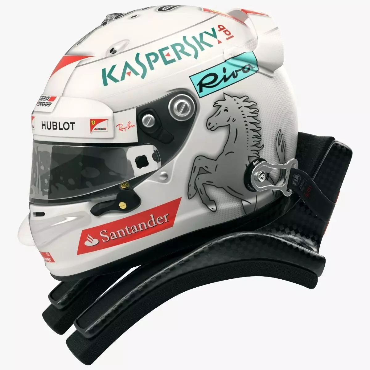 High-poly, ultra-realistic racing helmet model in Sebastian Vettel 2017 style. The 3D model and textures are based on the helmet that he used during the Australian GP, 2017. Alternative rear PED spoiler variations are included in the scene.