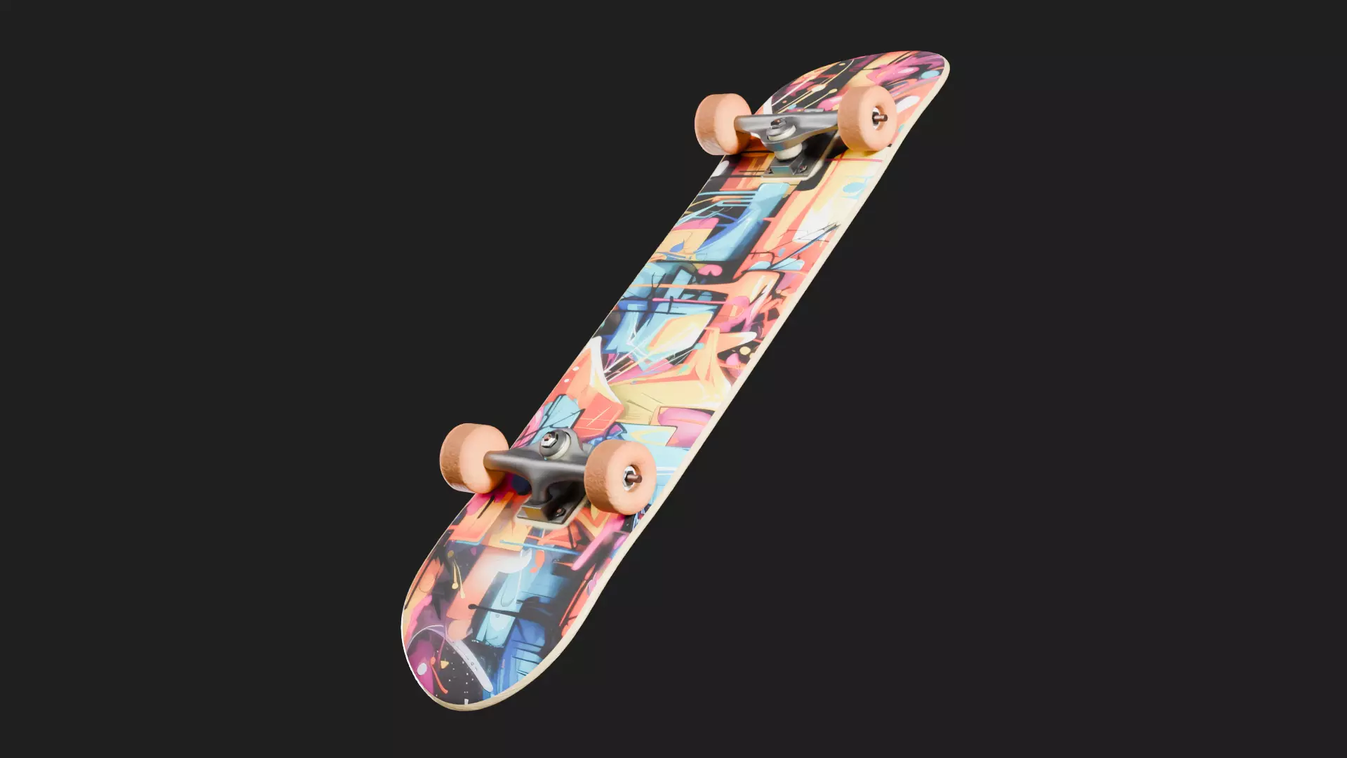 • Resolution: The model geometry consists of a moderate polygon count to balance visual quality and performance efficiency.Deck Surface: Features a unique and customized texture with abstract, vibrant, and striking graphics.Trucks and Wheels: Detailed modeling with realistic proportions, including components such as axles and bearings.