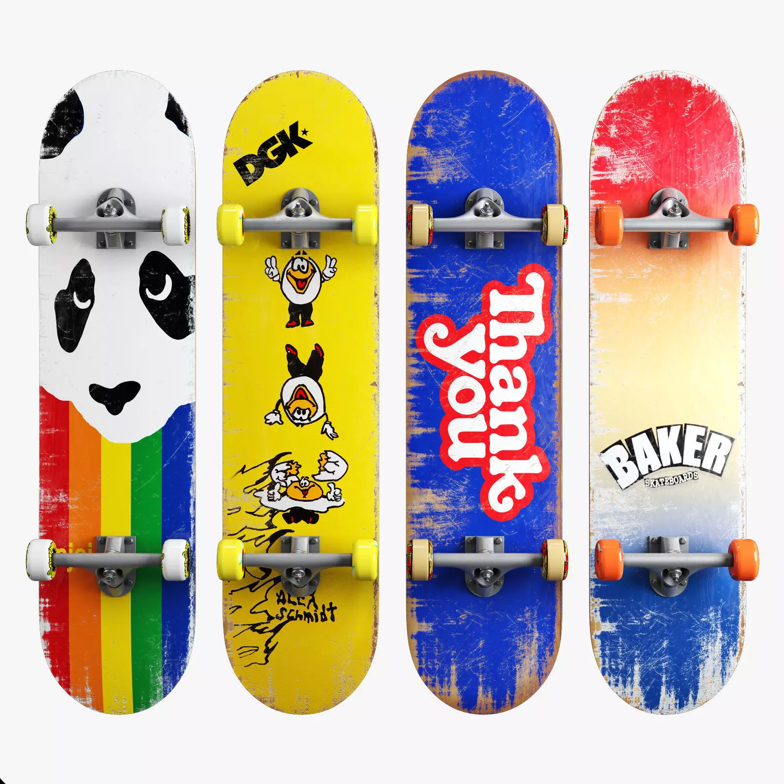 Realistic highly detailed model of a skateboard in four versions.