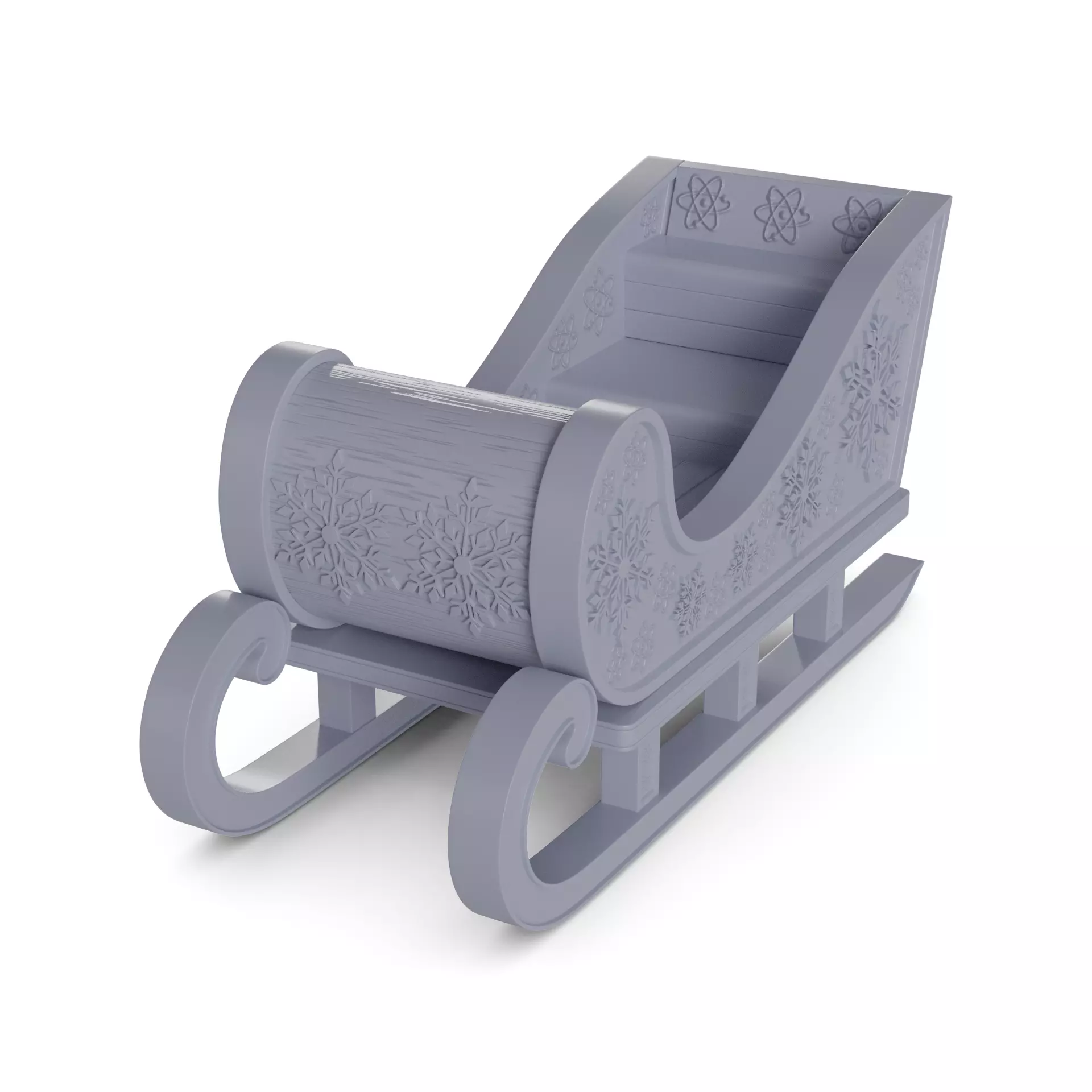 A snow sled made from smooth, frost-covered wood, painted in a shimmering silver hue, featuring intricate carvings of delicate snowflakes, ideal for winter adventures in the current timeline.