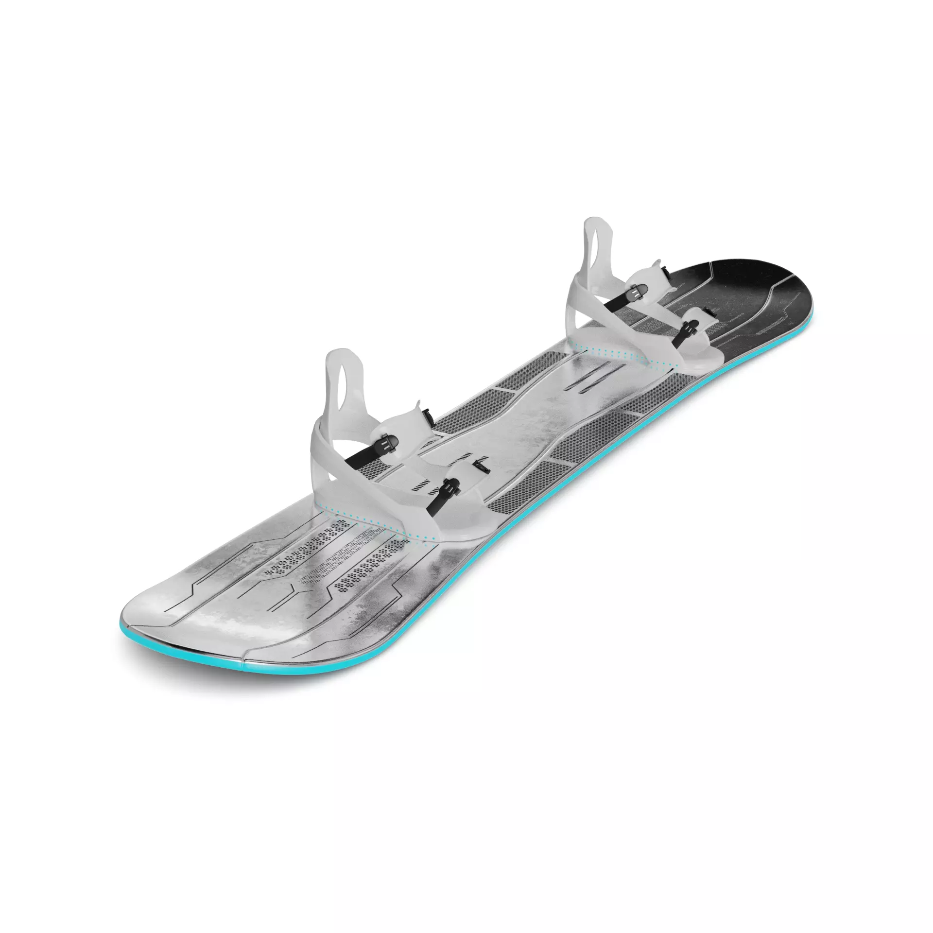 1 A futuristic snowboard made for civilian use, featuring a sleek and aerodynamic design with a metallic silver finish, equipped with advanced ice-gripping technology on the underside for maximum traction on icy terrains, and neon blue LED lights along the edges that illuminate the surrounding snow, ensuring both style and safety on the slopes.