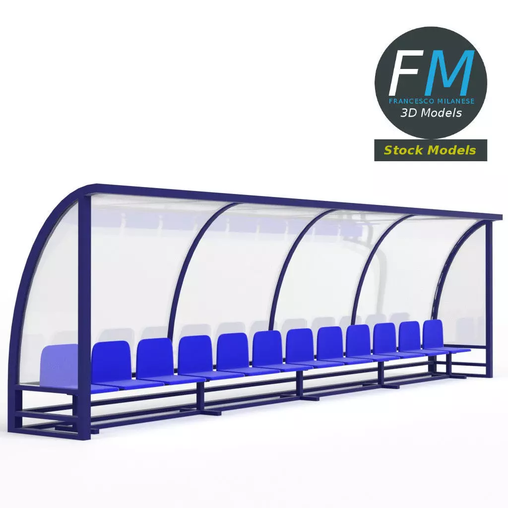 Soccer reserve bench 3D Model. 2 individual objects (frame, glass), each one with its own non overlapping UV Layout map, Material and PBR Textures set. Production-ready 3D Model, with PBR materials, textures, non overlapping UV Layout map provided in the package.