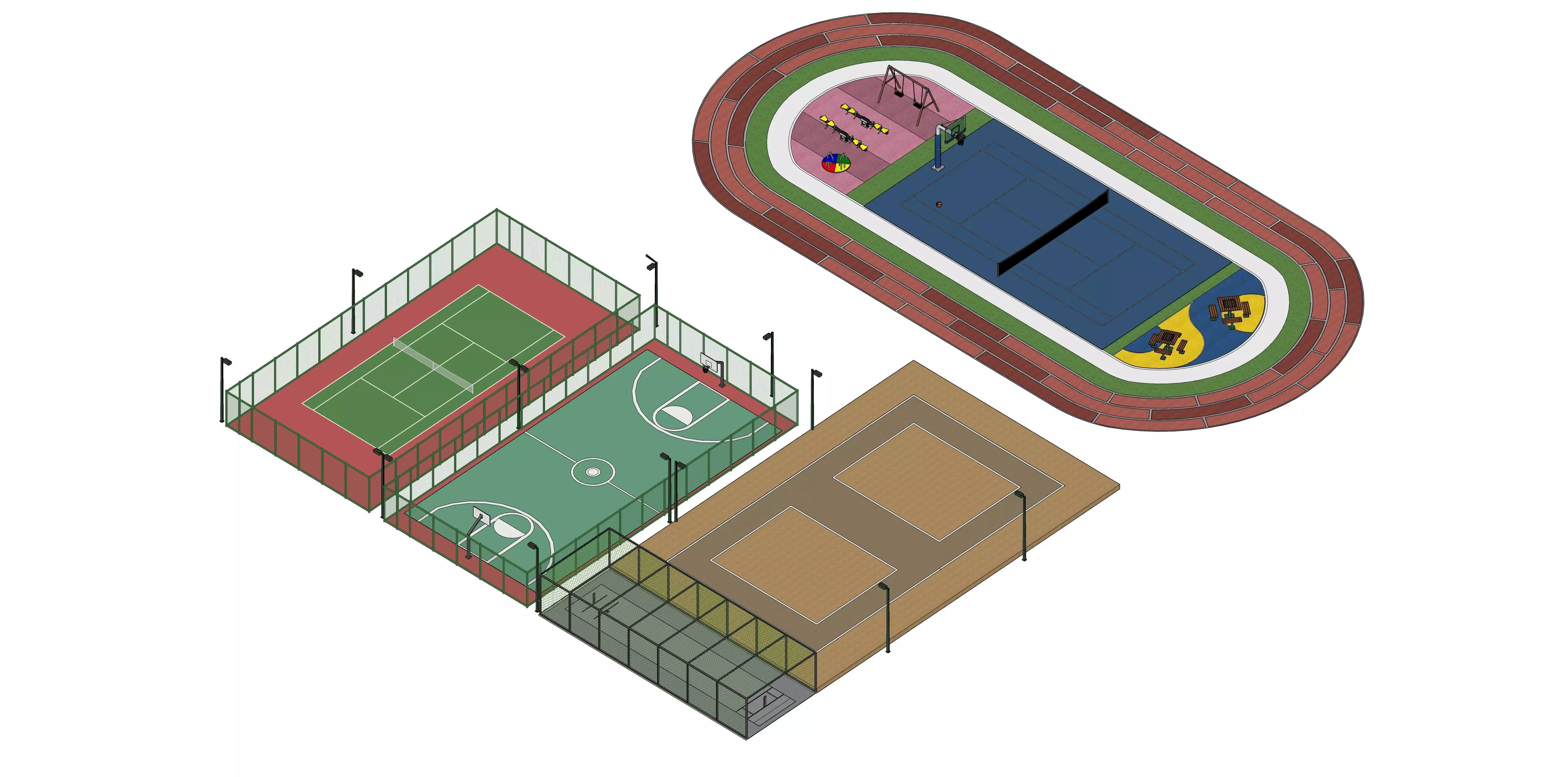 Playground & Sports Complex Model PackageExperience a complete sports and playground 3D model package designed for versatile use in schools, sports academies, parks, and residential complexes. This package features detailed sports courts, multipurpose tracks, and a kids' play area with modern equipment, perfect for both recreational and professional use.