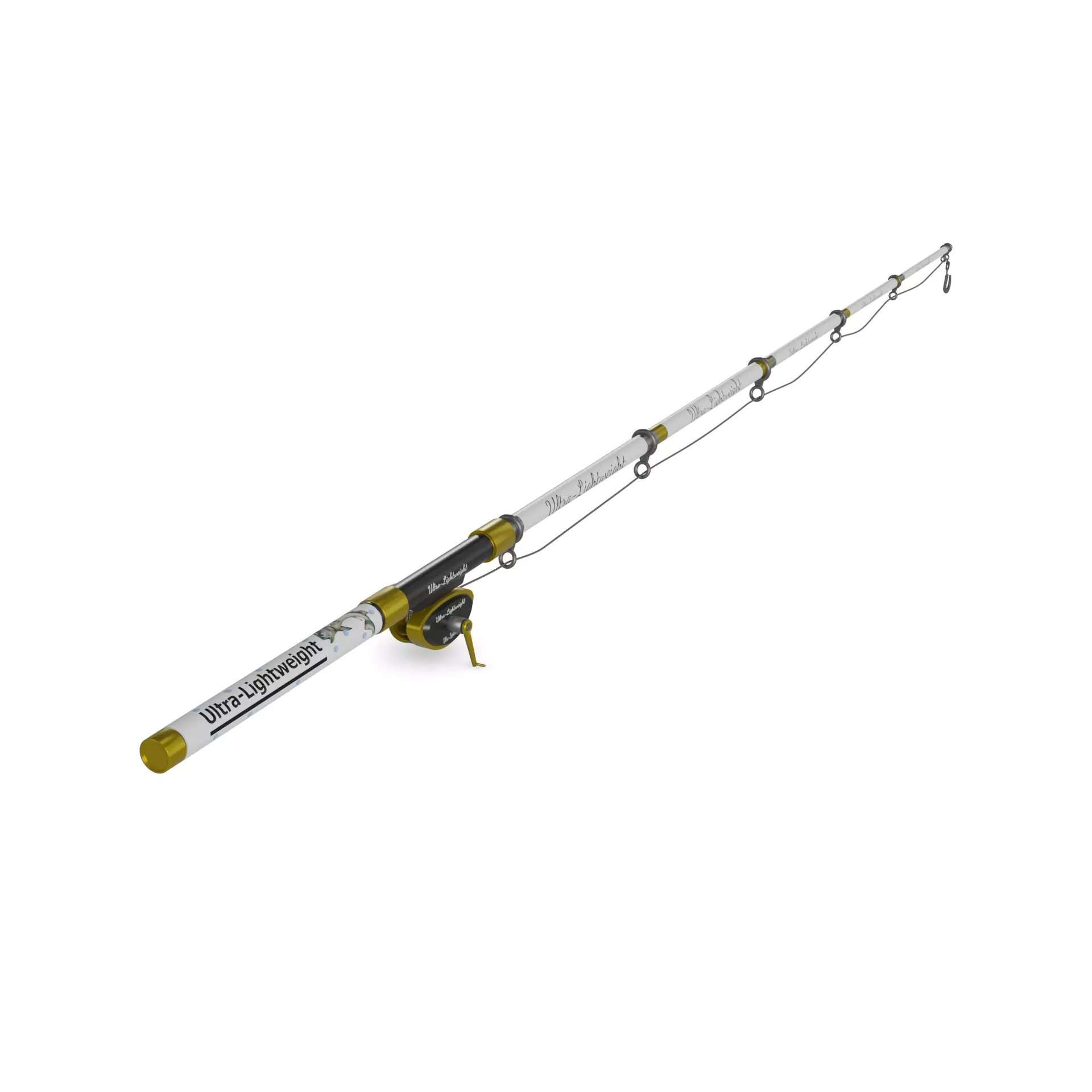 Fishing Rod: A lightweight fishing rod, ideal for both beginners and experienced anglers. The rod is made from carbon fiber, ensuring strength and flexibility. It comes in a long, cylindrical tube with a secure cap, making it easy to carry and store. The packaging features a label with the text Ultra-Lightweight and a graphic of a fish jumping out of water.