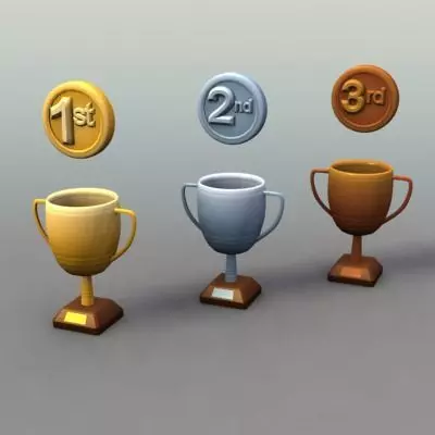 3 Trophy/Cup models - gold, silver and bronze, along with medals.