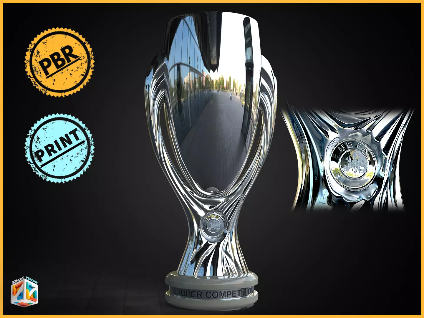 This UEFA Super Cup Trophy 3D Model embodies European football prestige with cinematic realism and meticulous detail — crafted for professional visualization, sports branding, and collectible rendering.