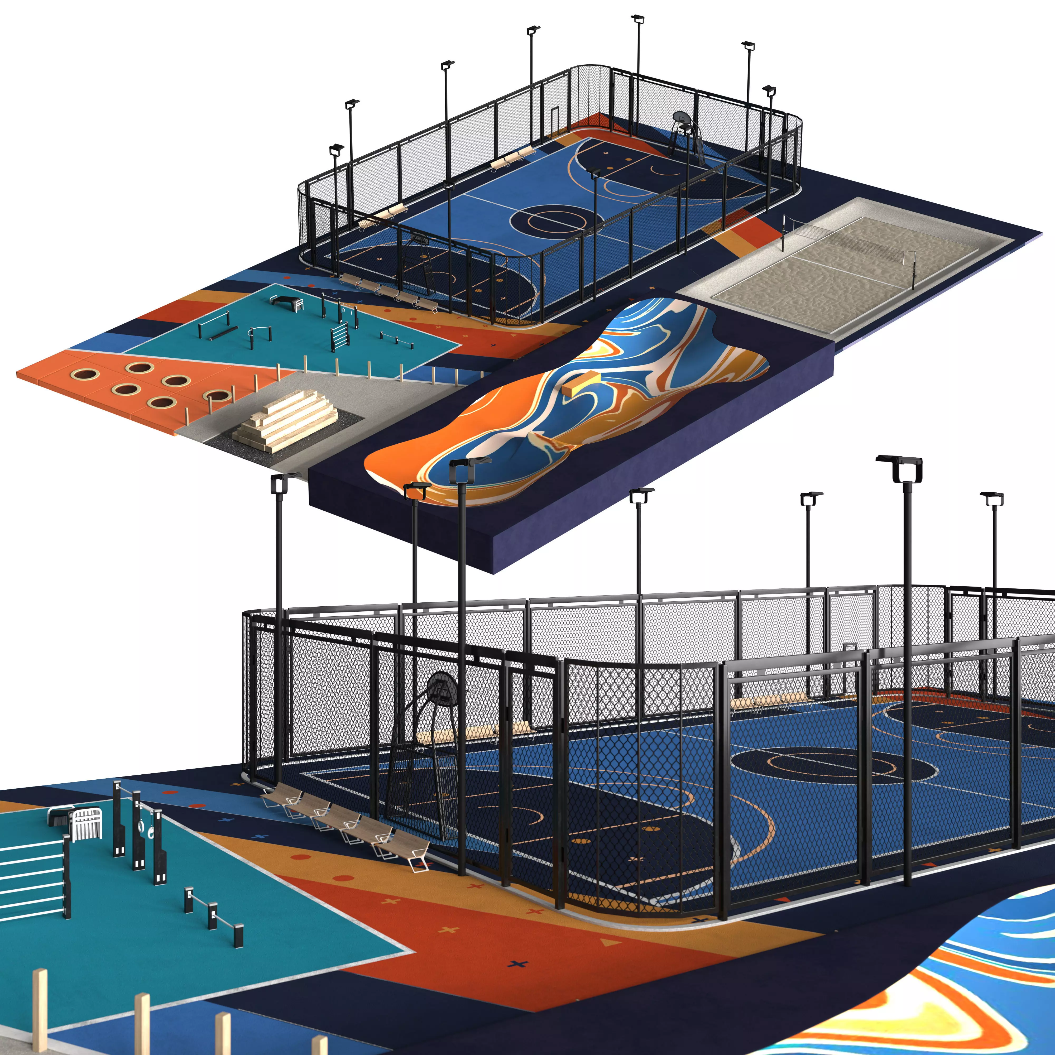 An exceptionally detailed and expansive 3D model of a modern urban sports and recreation complex. This comprehensive scene is ideal for large-scale architectural visualization, city planning simulations, virtual environments, and detailed game development projects.