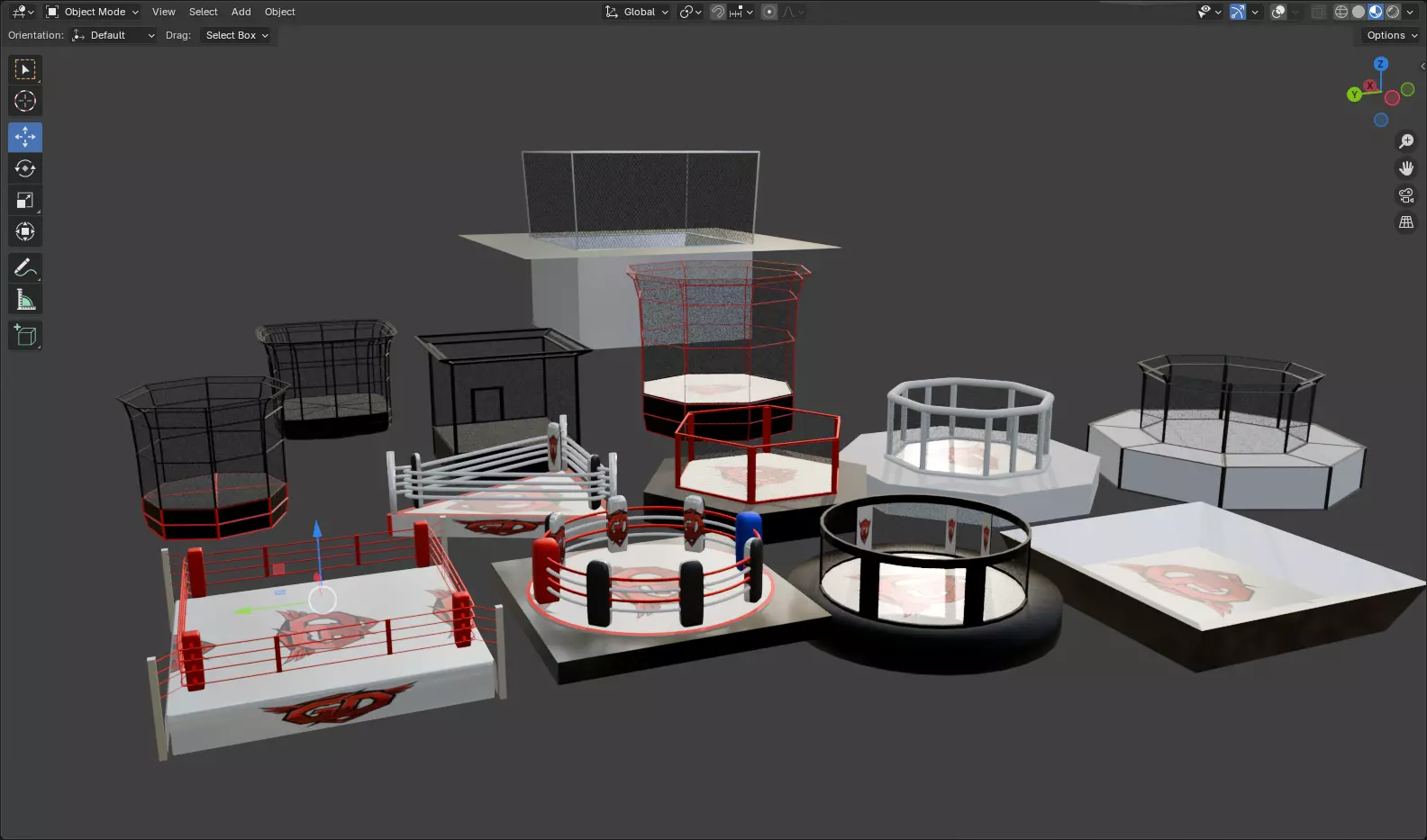 Street style pit, BKFC CIRCLE(Can be used as sumo) and BKB Tri Ring ,Karate combat pit, A hexagon MMA cage, and a Kickboxing ring. Updated Octagon,Circle Style cages and 4 street fighting cages Just the Sport stages https://www.cgtrader.com/3d-models/sports/equipment/official-style-fighting-arenasStreet Stages https://www.cgtrader.com/3d-models/sports/equipment/street-fighting-style-cages