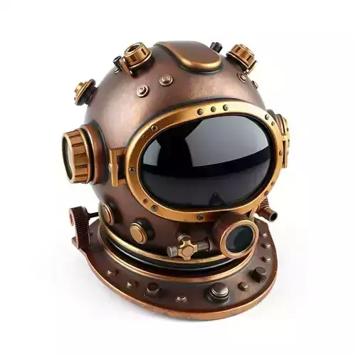 This meticulously crafted 3D model represents a vintage deep-sea diving helmet, embodying the robust and adventurous spirit of early aquatic exploration. Its design draws inspiration from classic atmospheric diving suits, featuring a distressed copper or bronze finish complemented by golden accents, rivets, and functional-looking valves. The large, dark viewport adds to its mysterious and iconic appeal. This versatile asset is ideal for a wide array of digital projects, including game development as an environmental prop, character accessory, or collectible item. It excels in architectural visualization for creating historical or nautical-themed interiors and displays, and is perfectly suited for use in augmented reality (AR) and virtual reality (VR) applications, adding an authentic touch to immersive experiences. Digital artists will find it an excellent subject for still renders, animations, or as a detail element in complex scenes. The model is prepared with clean, optimized topology, ensuring smooth performance in real-time engines while also being suitable for high-quality static renderings. It comes fully UV unwrapped and includes high-resolution PBR (Physically Based Rendering) textures, providing realistic material properties and wear. Supported file formats typically include GLB, OBJ, FBX, USD, DAE, and ABC, making it widely compatible across various 3D software and engines.