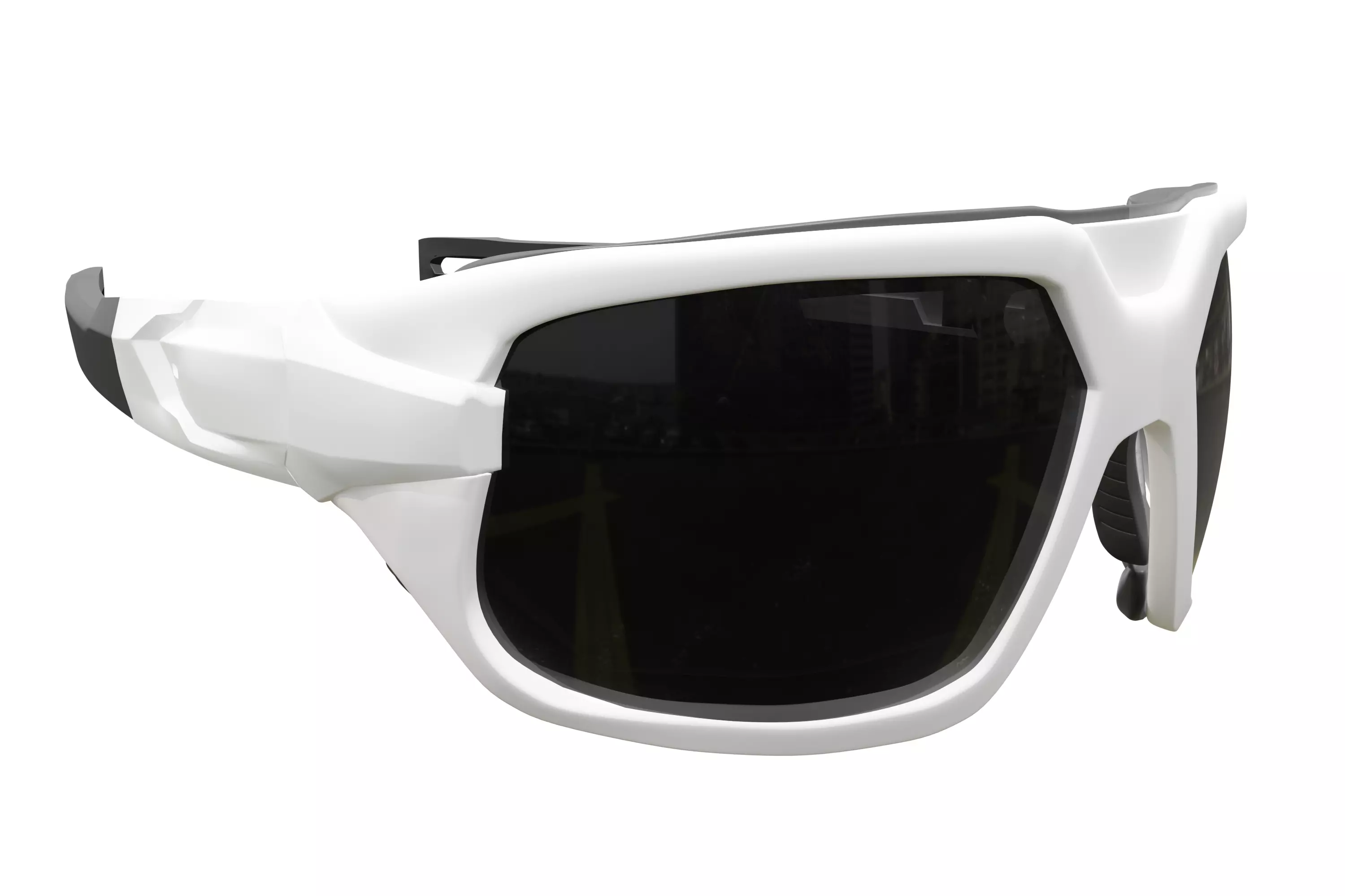 This is a 3D model of a pair of modern sports sunglasses featuring a sleek white frame and dark lenses, created natively in Blender. The design incorporates a streamlined, ergonomic shape. Please note that this model does not have UV unwrapping and includes several subdivision surface modifiers still applied, allowing for further detail adjustments in Blender. The materials are set up within Blender. This asset is suitable for Blender users and can be adapted for athletic visualizations, character design, and product showcases. The wireframe image is provided to show the underlying geometry.