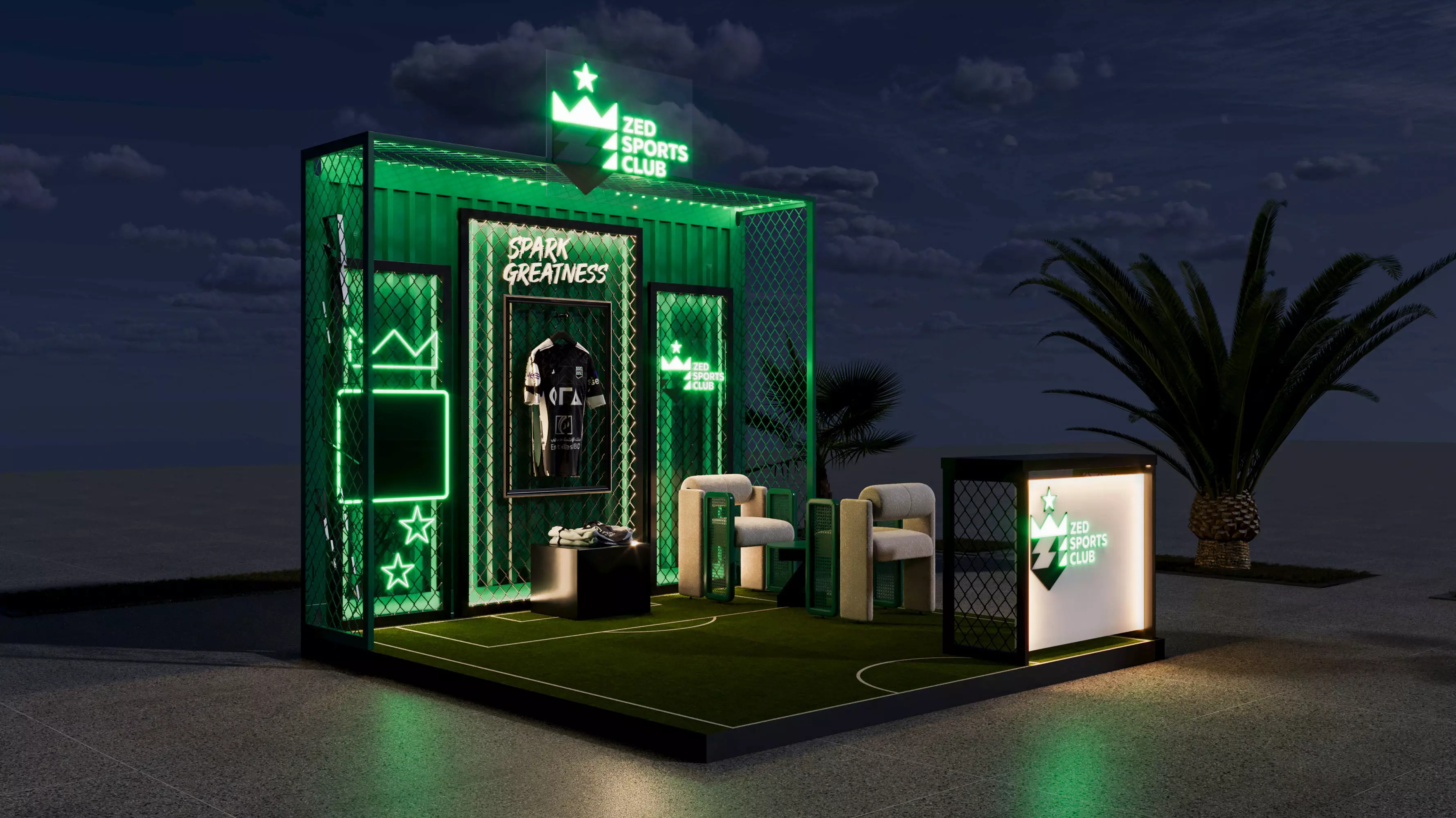 Description:A high-quality 3D model of a modern sports exhibition booth, perfect for trade shows and sporting events. The design features a metal frame with mesh panels, vibrant green neon lighting, and sports-inspired decorative elements. The booth includes a stylish seating area, a display screen, and a dedicated platform for showcasing sports merchandise like jerseys and shoes.