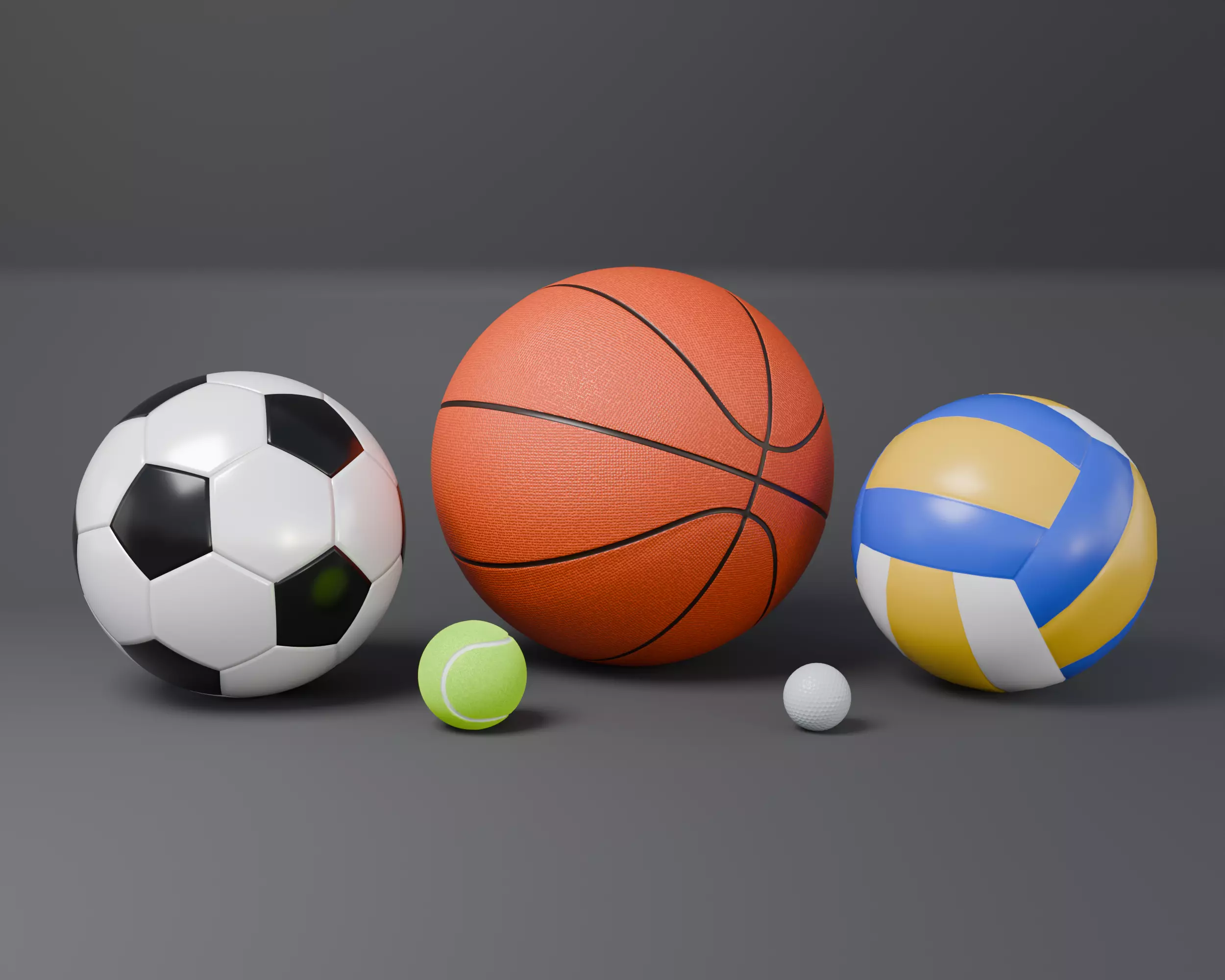 The set includes: a soccer ball, a basketball, a volleyball, a tennis ball and a golf ball. Balls in original sizes. There are no auxiliary backgrounds, lighting or camera in the scene. Render - Cycles.