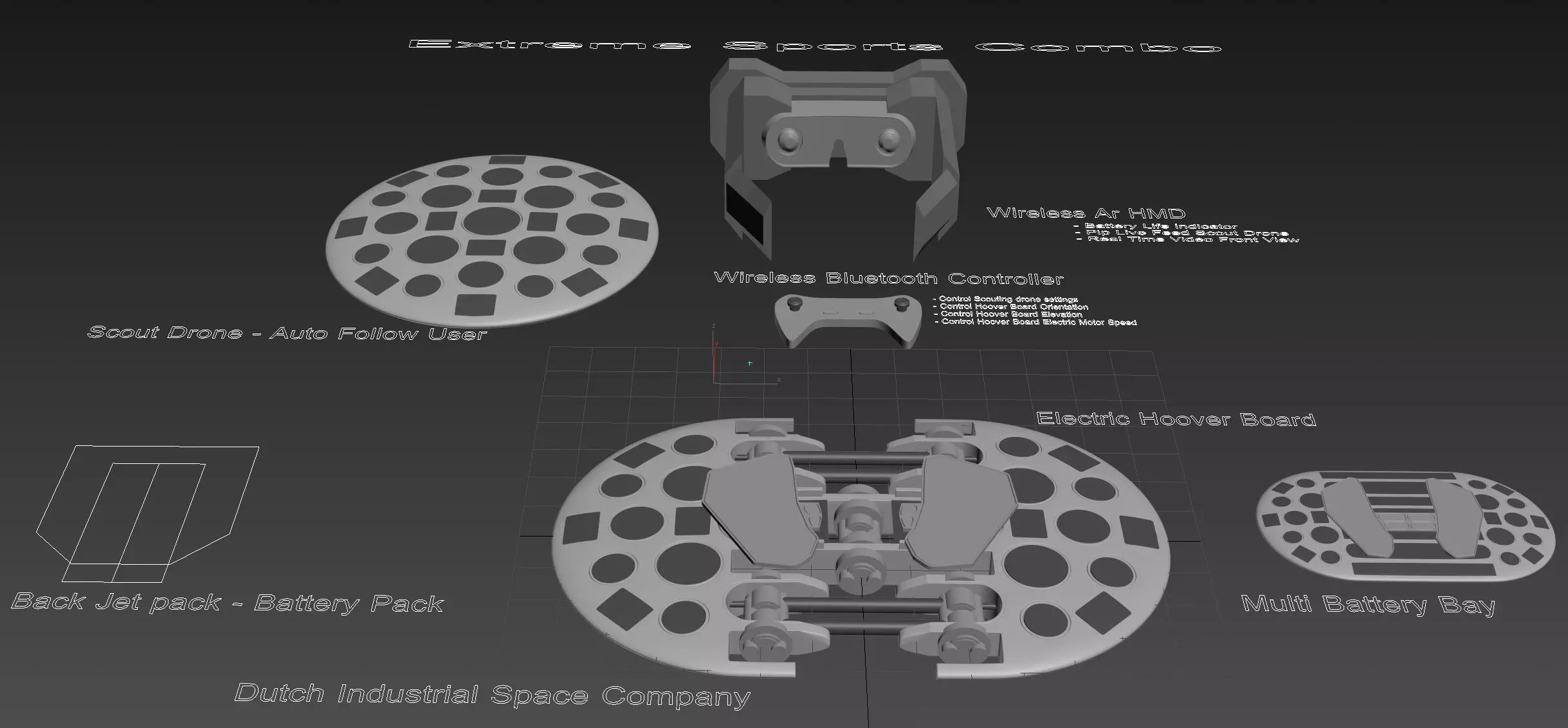in the Mono model for instance, the combined usage of 18 electric motors, all counter-spinning and working in unison should be able to generate enough lift for carrying a man-sized load, of course depending on scale of the 3D print-out of the hull and fitting electric motors sizes used. a small scale replica or scaled model could easily be realized, as well as have it be equipped with a aerodynamically built into the model 4k camera module. allowing for a unhindered top and bottom intake of fresh air flow to be cast straight downward through the boards design.the Dual model should nearly be twice as strong, carrying twice the amount of electric motors, and also even carries more battery pack weight, so one could finally maybe eventually even put a wind surfing sail / axis, centered on top hull part to allow for real-time sky surfing, using the board for hoovering at altitude and it's altitudinal wind for directional motion of the pilot. maybe i should model it in, maybe i'm taking it a little bit too far, who knows. hope you enjoy the dream (or do you happen to know some one bored from Dubai?) and these screen-shots i made for you with me.