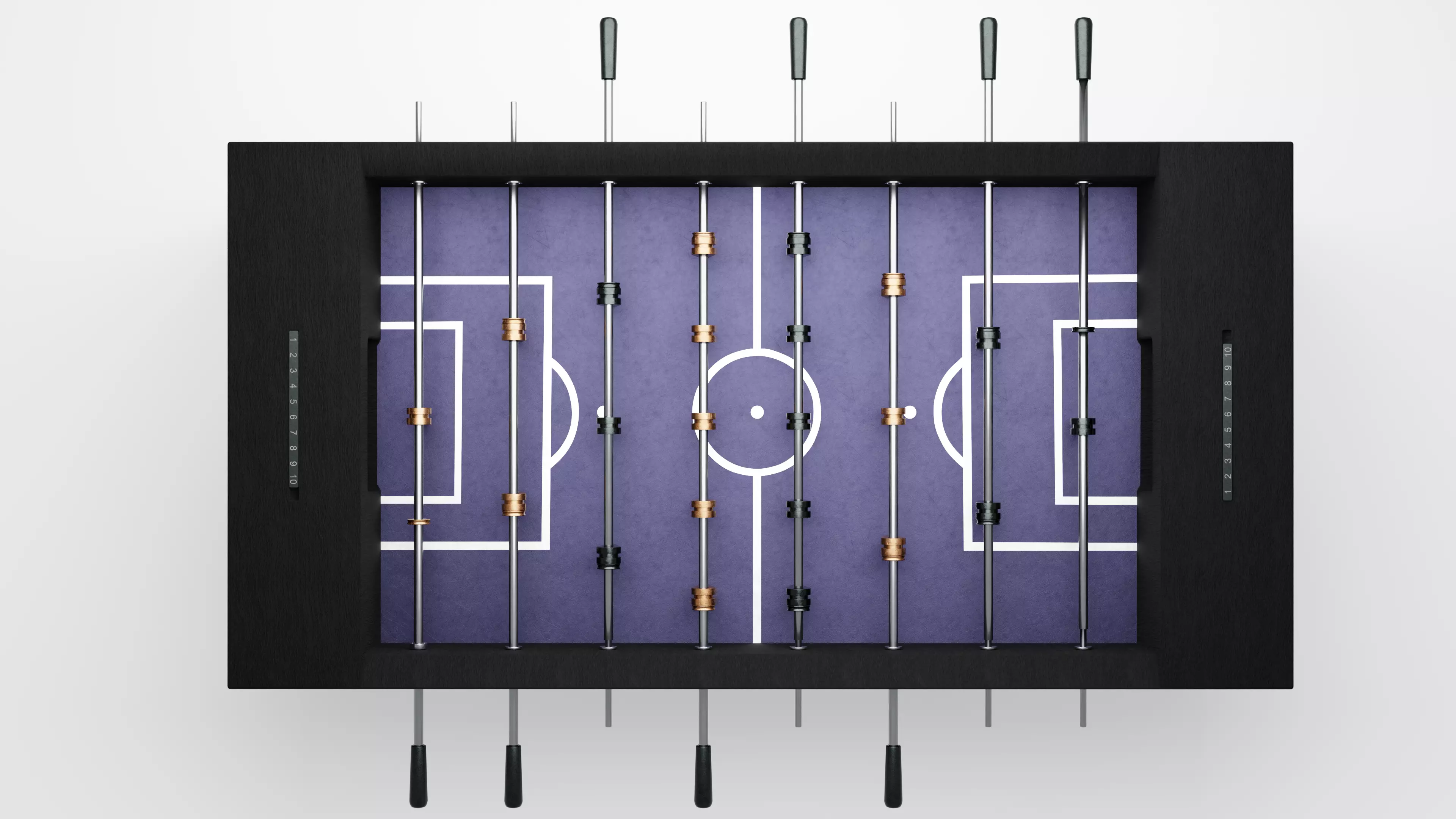 3D model of a classic wooden Foosball Table with textures. It features retractable rods, metal players and a sleek finish. The model was created in blender and rendered with cycles