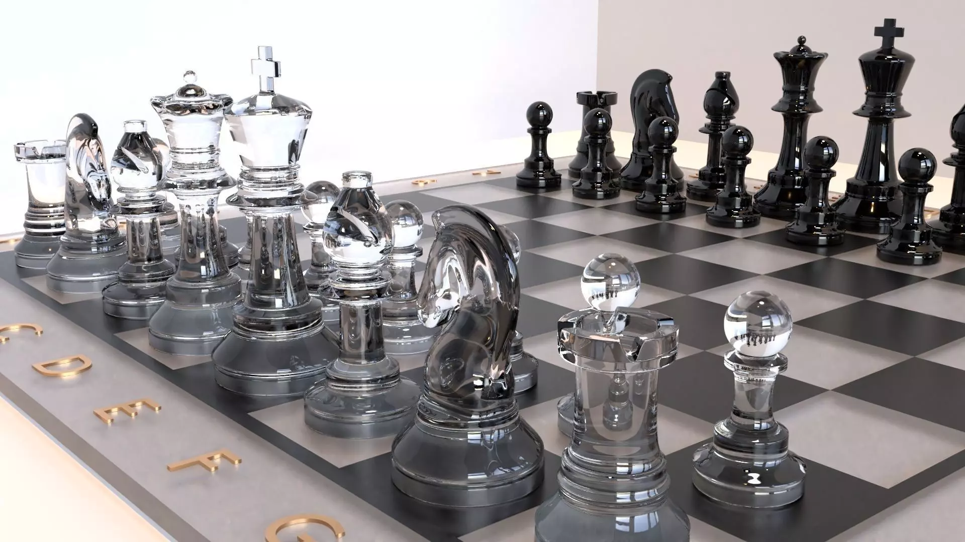 The glass chess set include all the pieces board. The pieces have realistic glass material on them, the board has frosted glass material and the letters and numbers have a gold material. On the bottom of the board are round pieces of felt(felt material).
